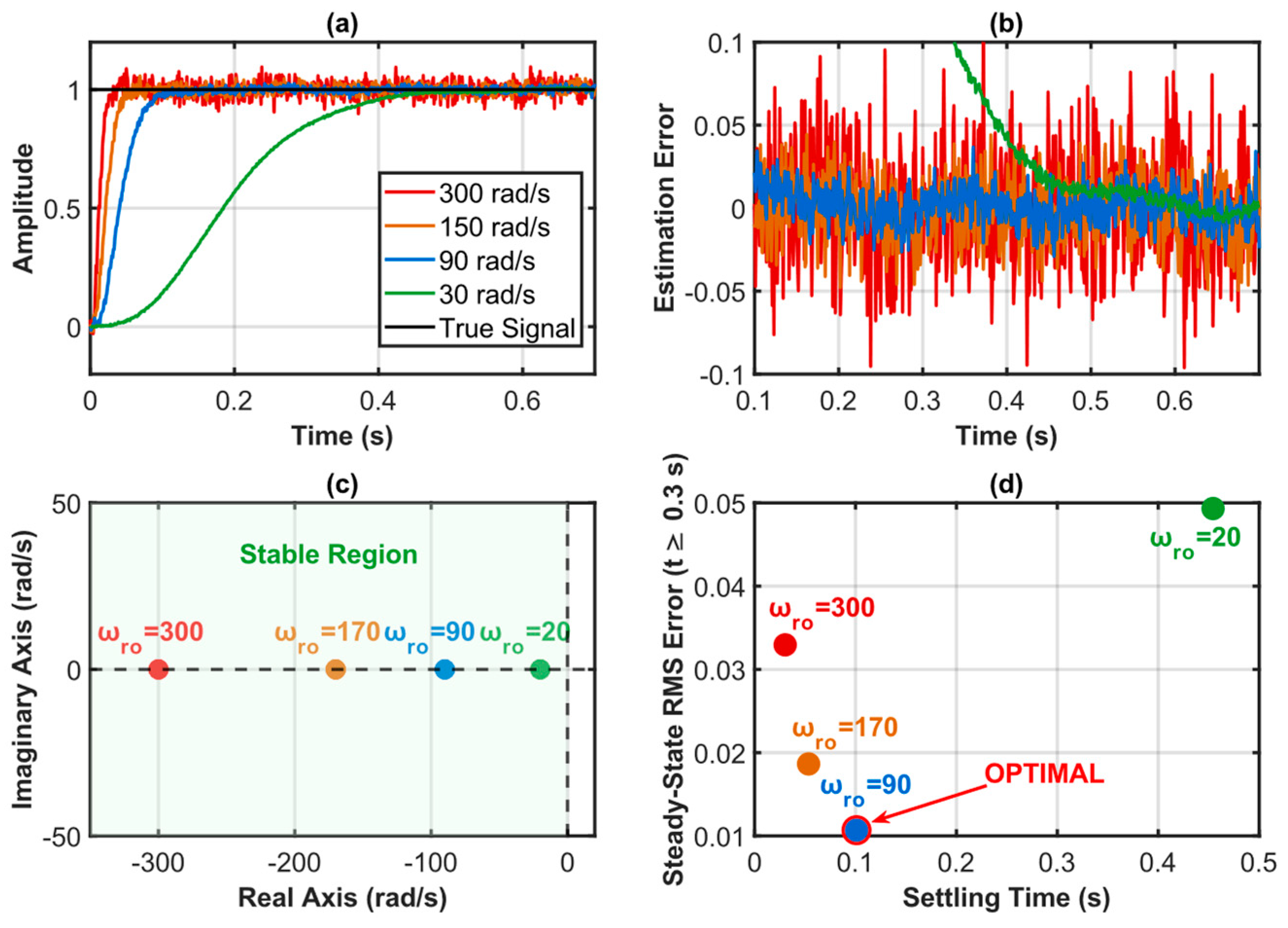 Figure 6. Waveforms and pole locations of IDO for different values of ωro (a) estimated signals with 2% Gaussian noise and true signal, (b) estimation errors, (c) pole-locations, and (d) steady state RMS error vs. settling time.