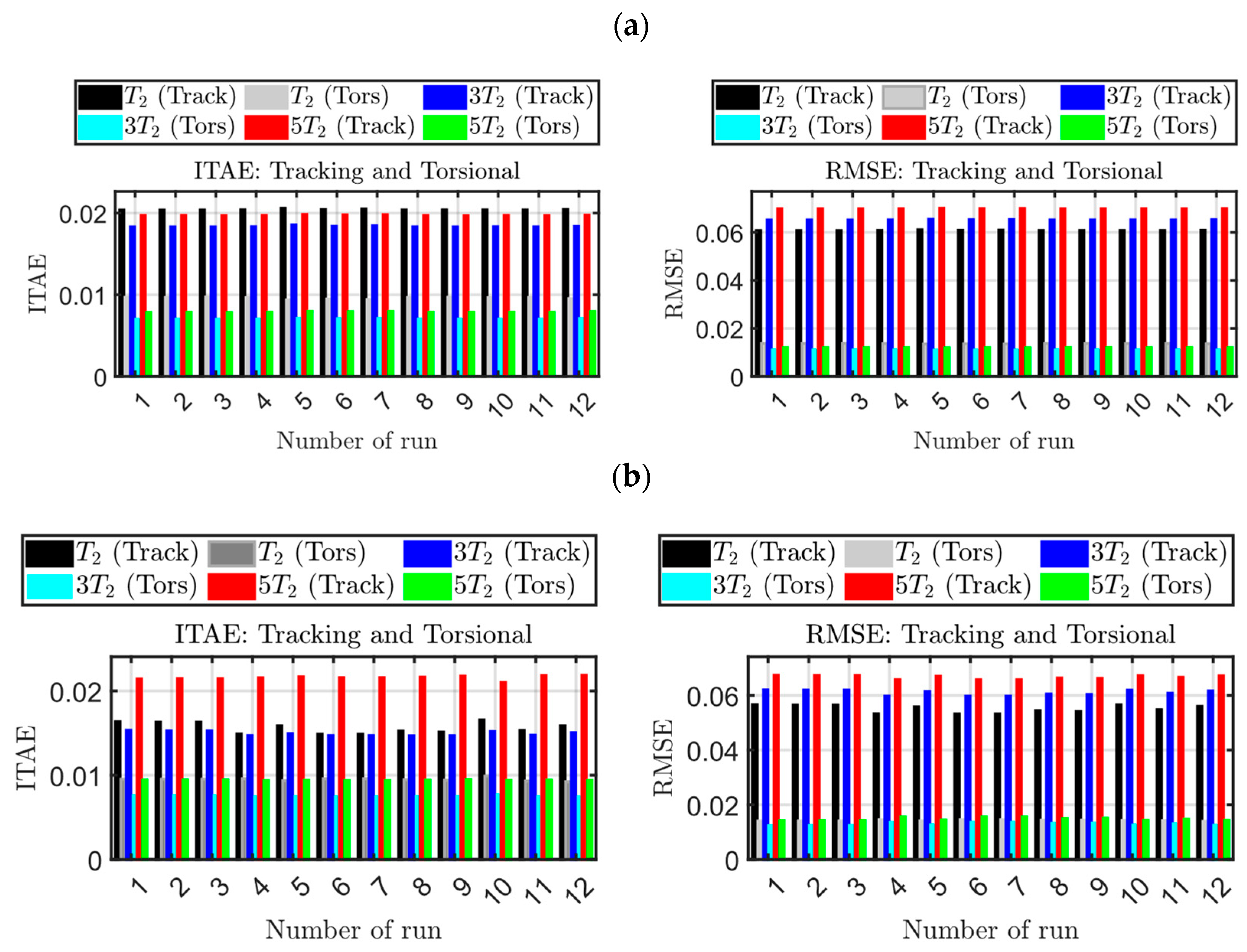 Figure 8. Bar graph for trajectory tracking and torsional RMSE and ITAE. (a) Structure 1 and (b) Structure 3.