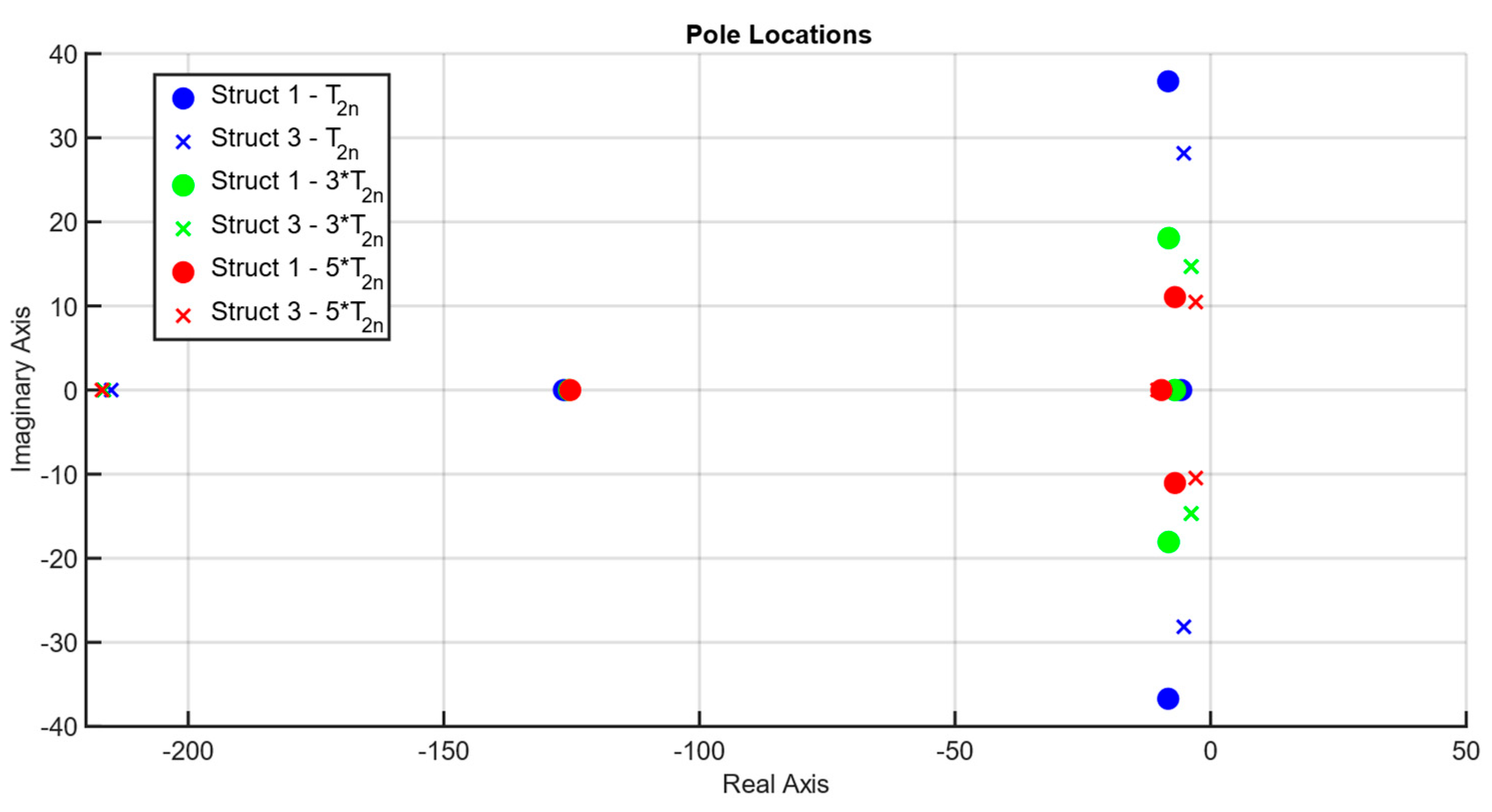 Figure 9. Pole locations for the transfer function of the proposed control structures under T2 variation.