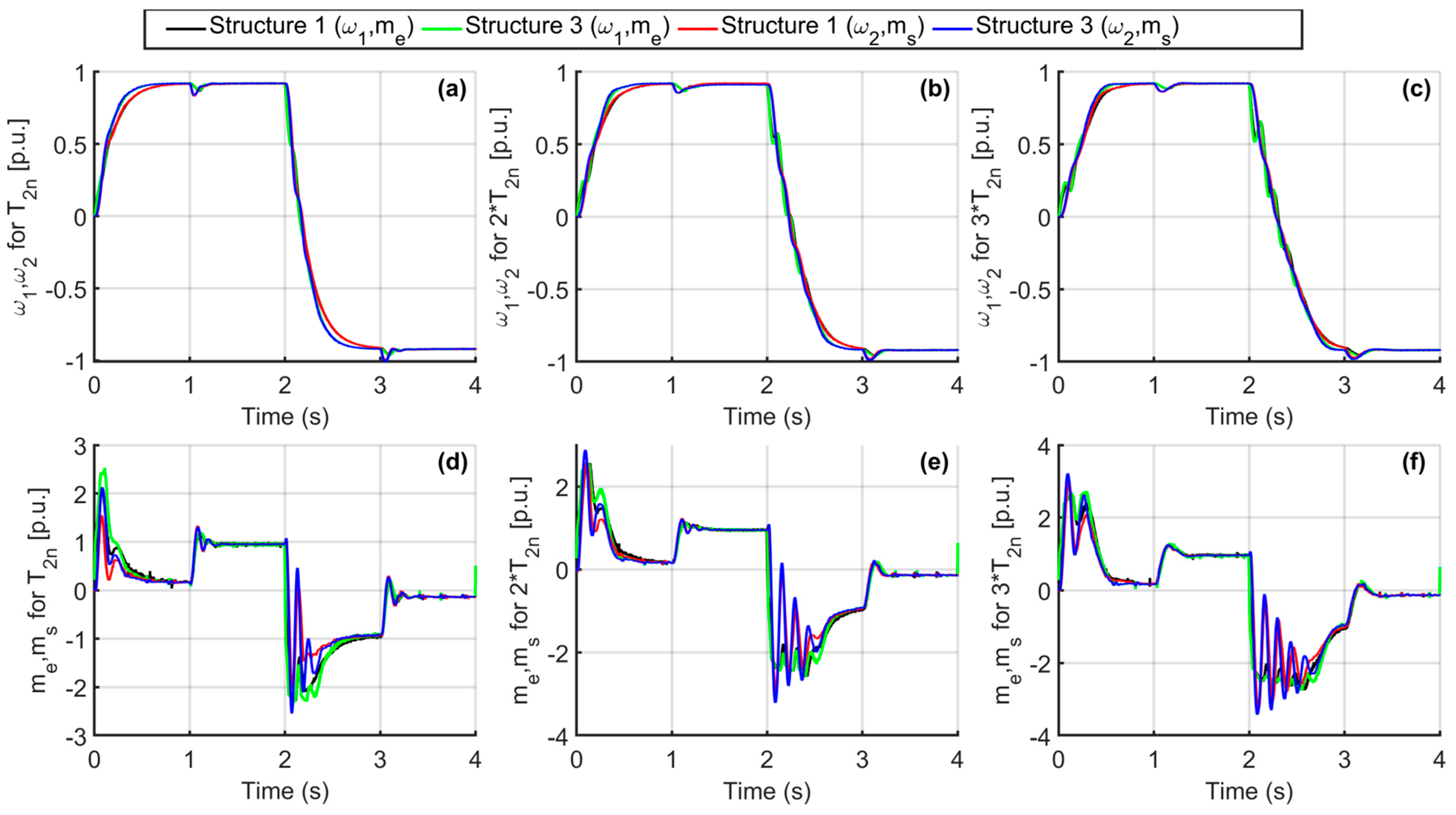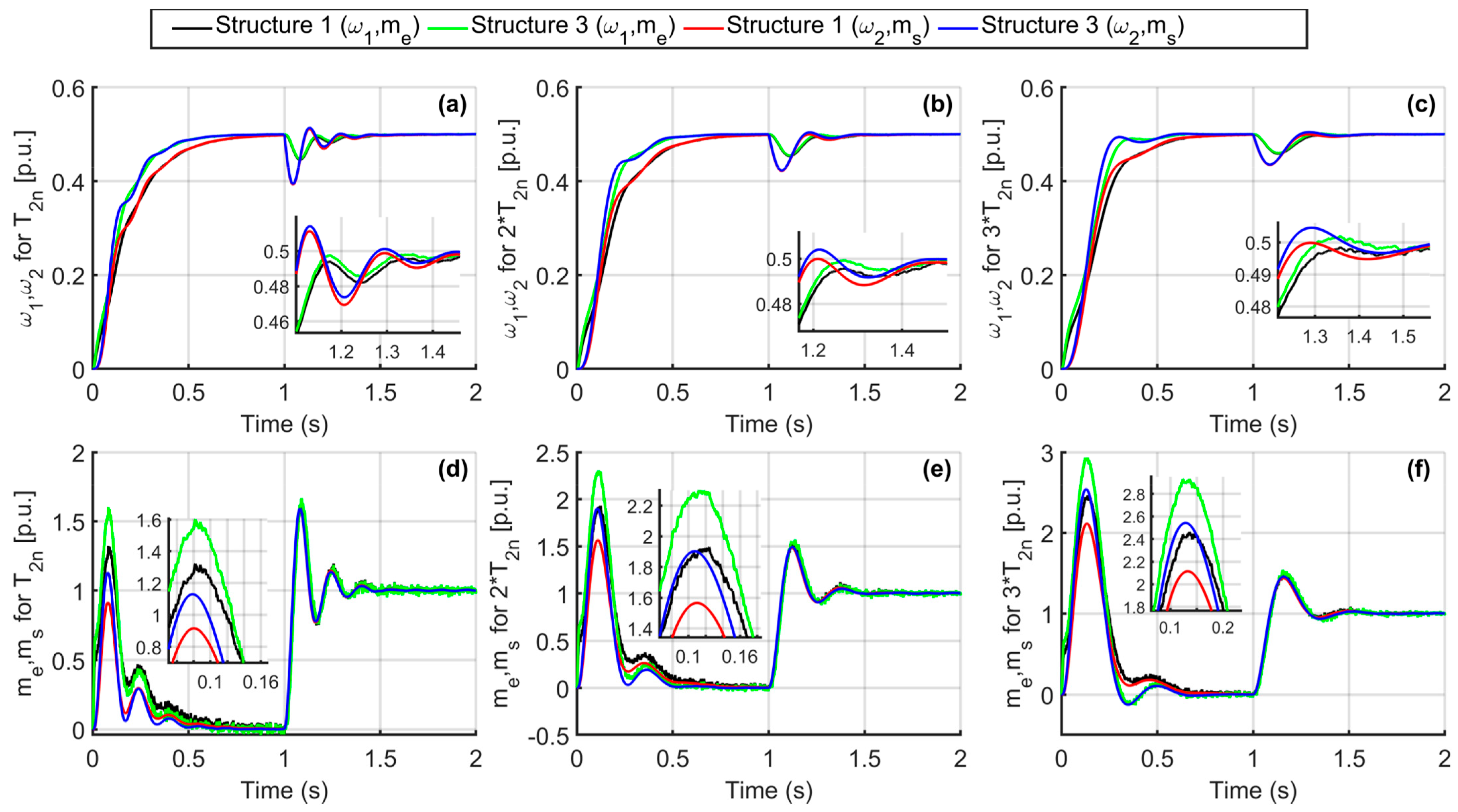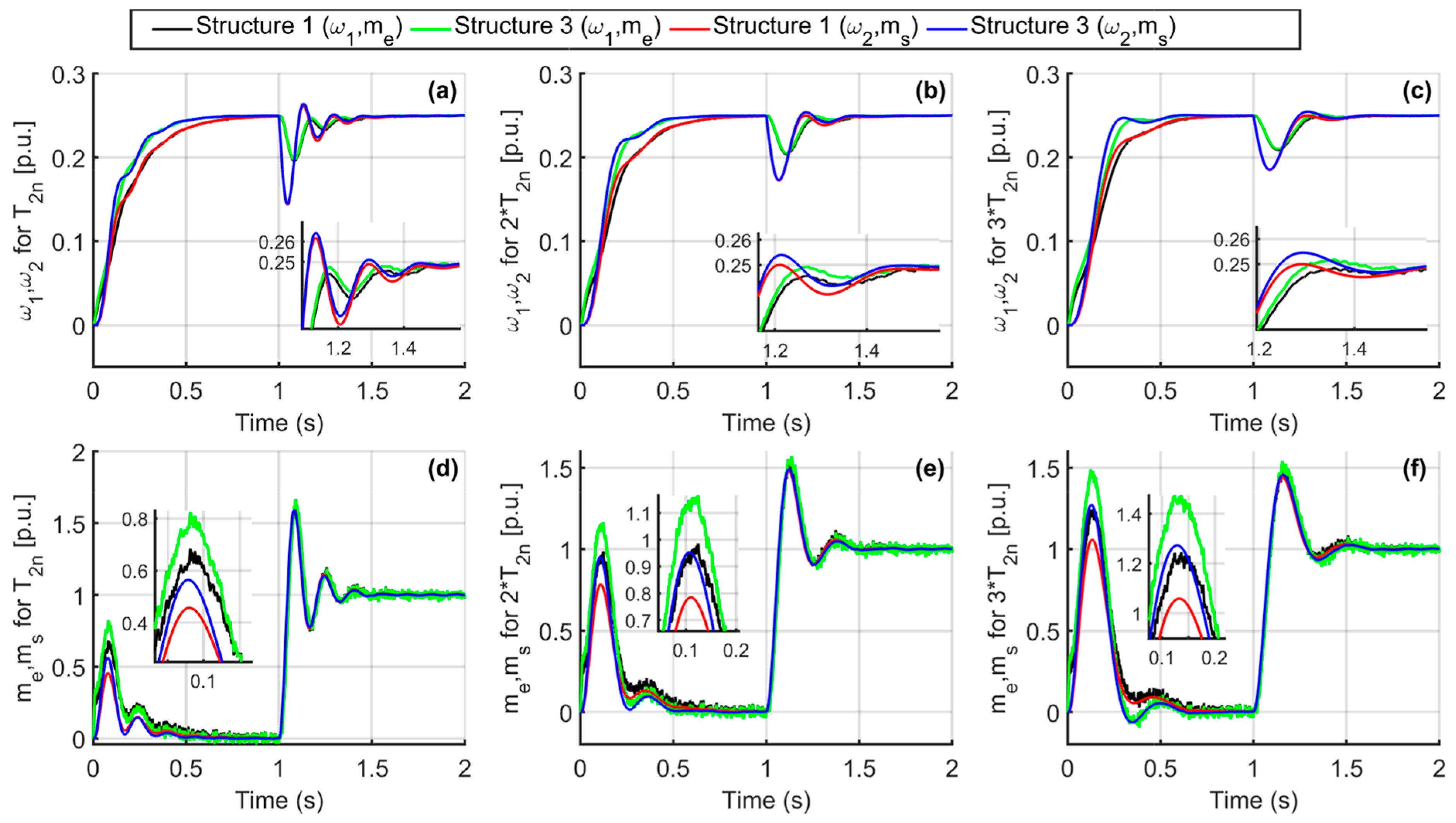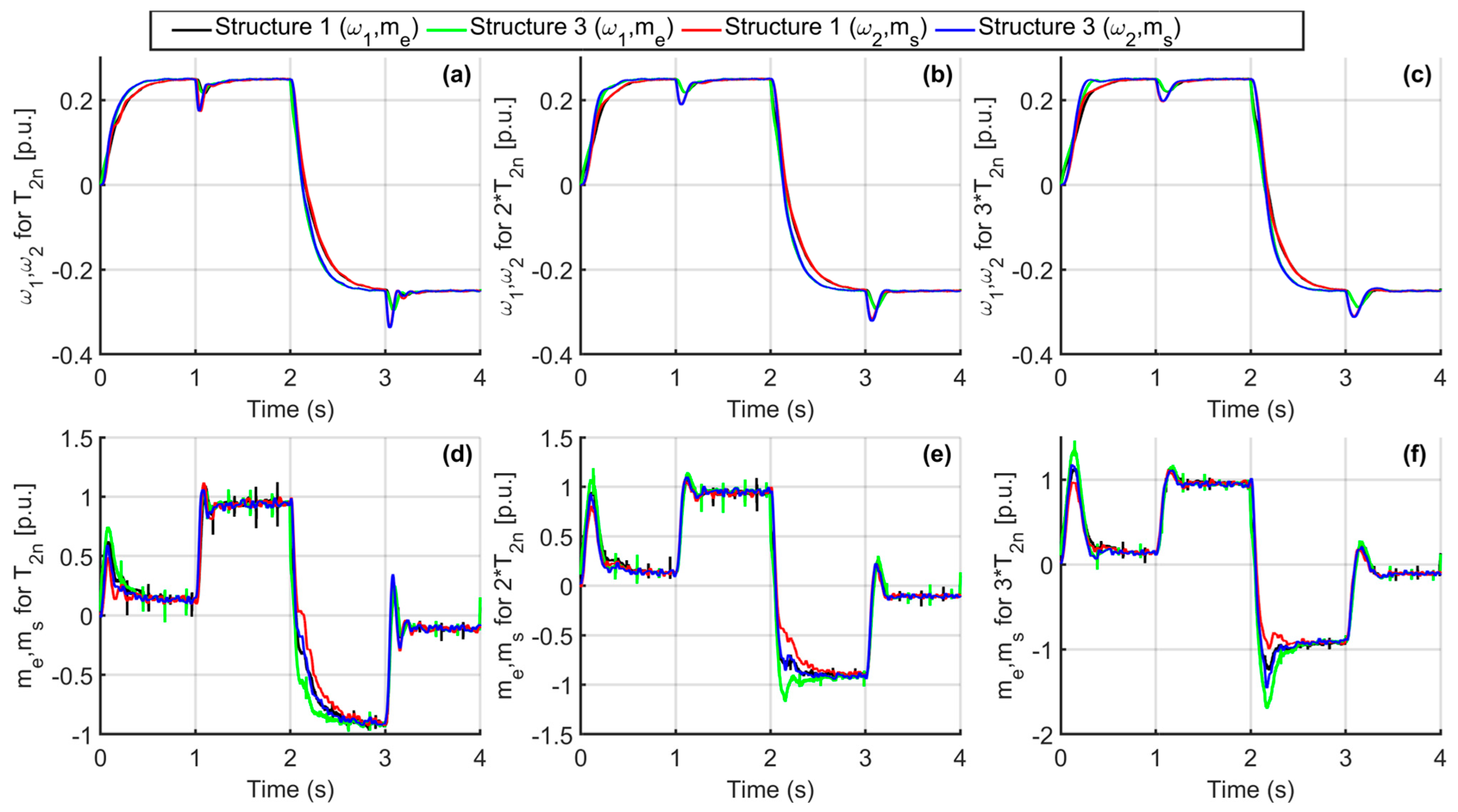 Figure 18. Transients of the two-mass system: motor (balck and green) and load (red and blue) speeds (ac), electromagnetic (balck and green) and torsional (red and blue) torques (df), nominal value of T2 (a,d), two times the nominal value of T2 (b,e), and three times the nominal value of T2 (c,f). Structure 1 (black and red), structure 3 (green and blue)—experimental results are for reference speed near 1 p.u.