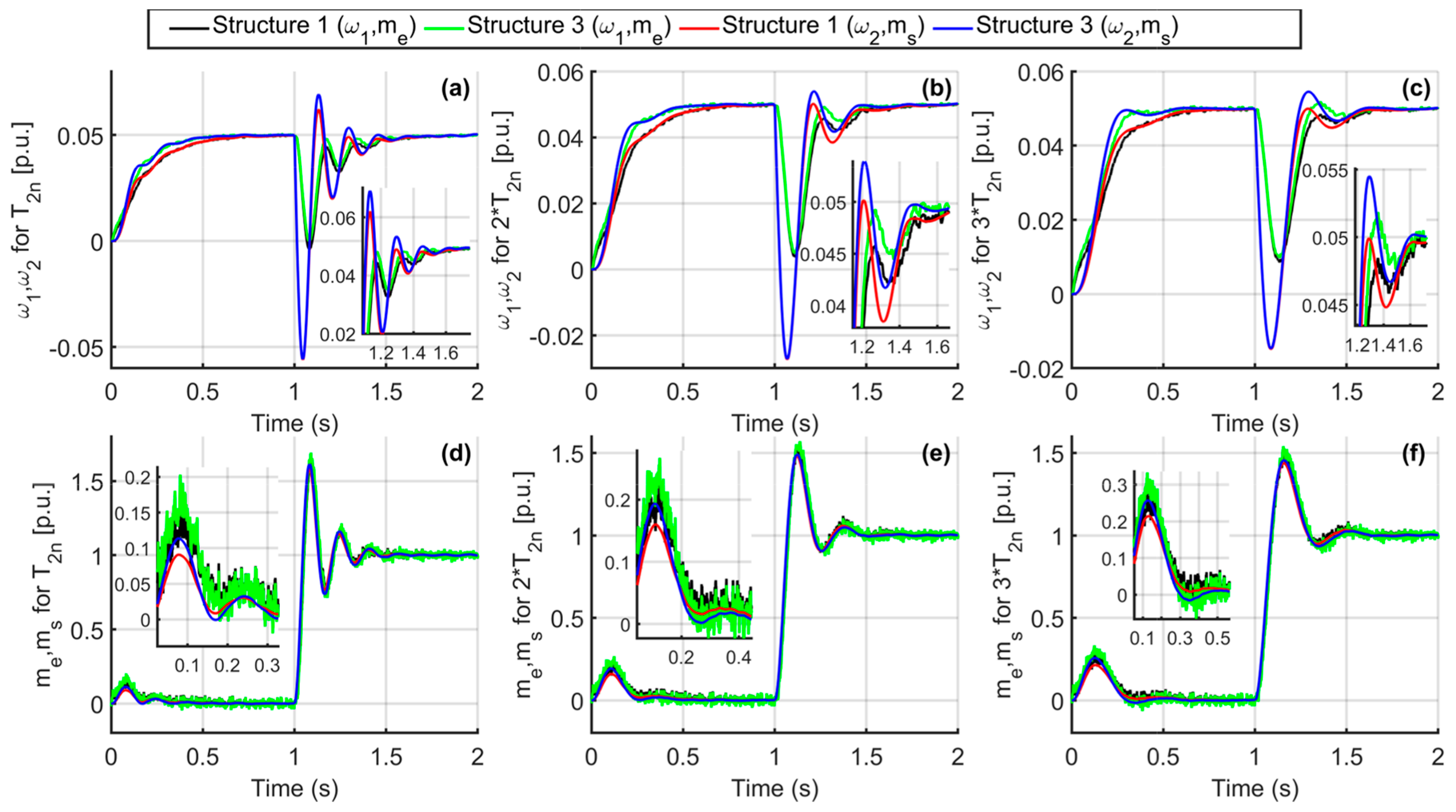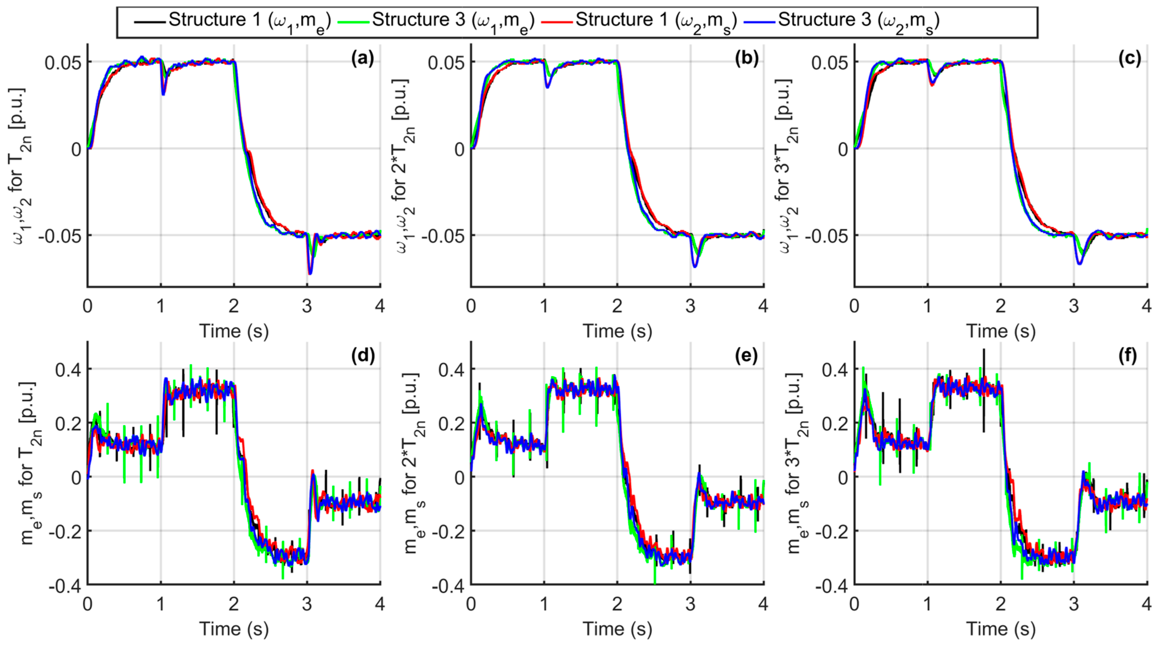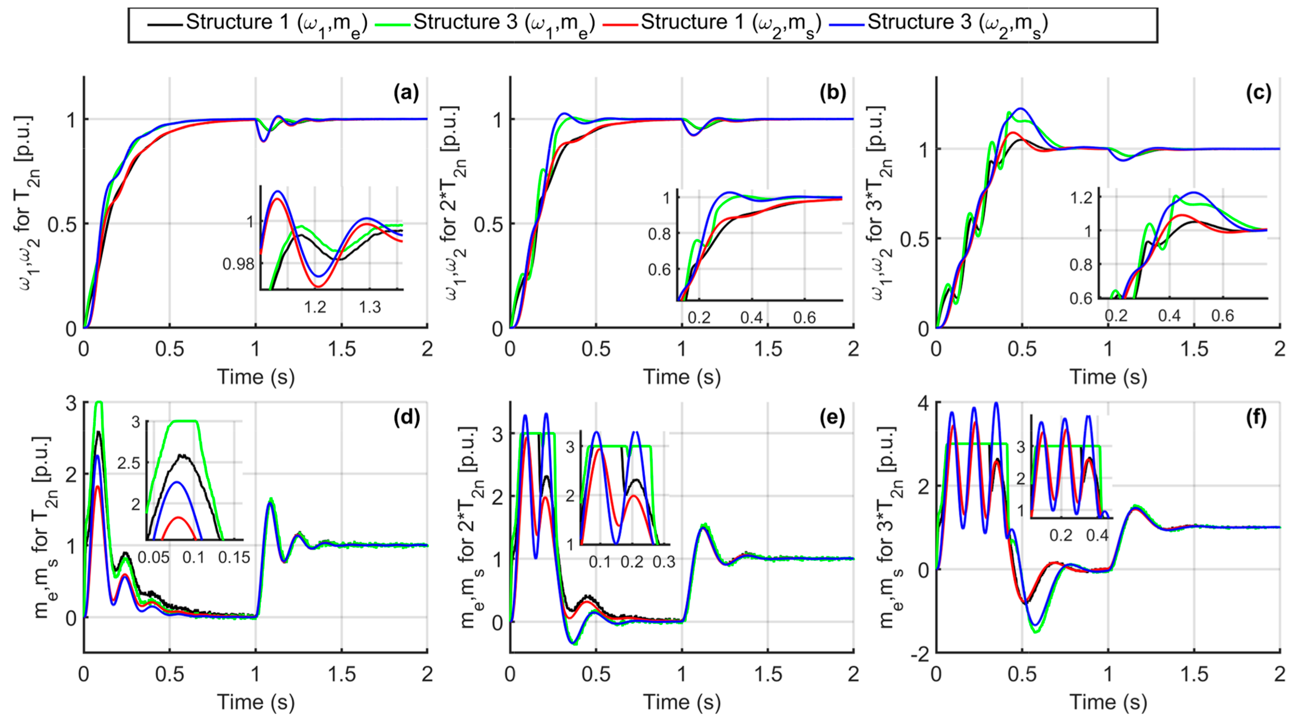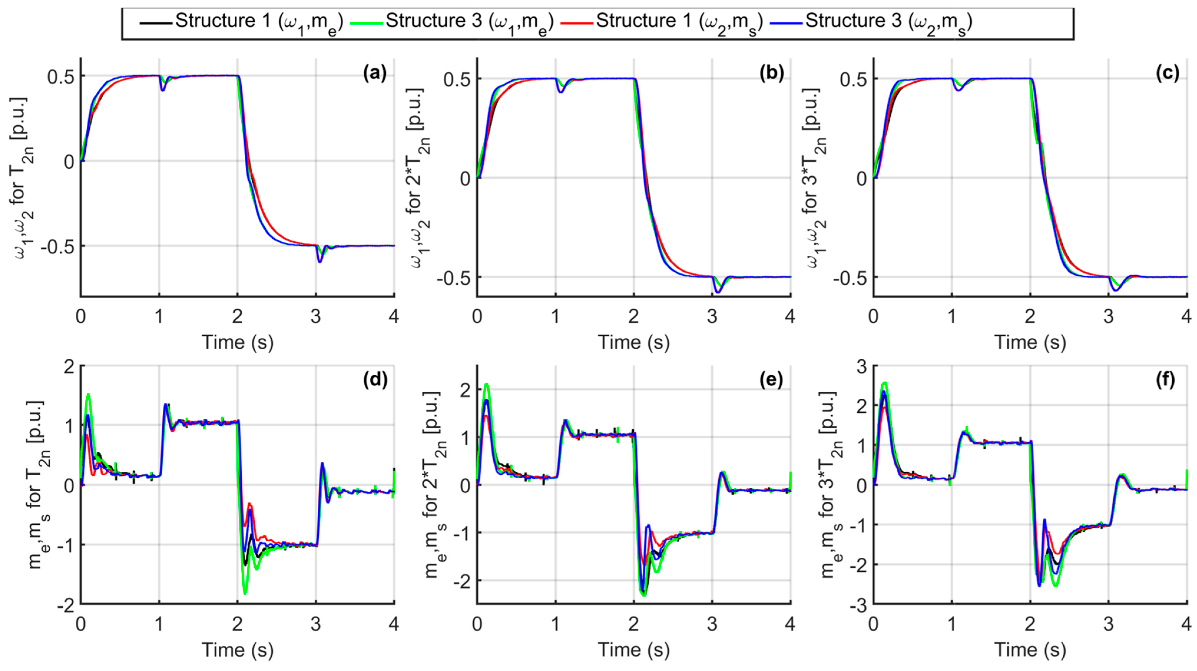 Figure 18. Transients of the two-mass system: motor (balck and green) and load (red and blue) speeds (ac), electromagnetic (balck and green) and torsional (red and blue) torques (df), nominal value of T2 (a,d), two times the nominal value of T2 (b,e), and three times the nominal value of T2 (c,f). Structure 1 (black and red), structure 3 (green and blue)—experimental results are for reference speed near 1 p.u.