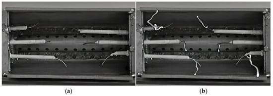 Under ambient temperature and pressure in an open environment, three high-voltage electrodes were inserted into each of the two side plates of the vaporizing flame holder. The electrodes, with a diameter of 1 mm, were insulated by ceramic tubes. The distance between the tip of each electrode and the inner contour surface of the stabilizer was approximately 5 mm. The six electrodes were distributed roughly uniformly along the spanwise direction of the stabilizer to maximize the contact area between the gliding arc and the fuel–air mixture, thereby enhancing the fuel–air activation effect. Viewed from downstream towards upstream of the stabilizer, a photograph of the six-channel gliding arc ignition and combustion assistance actuator and the discharge morphology captured by a high-speed camera are shown in Figure 2. Due to machining and assembly tolerances, it was difficult to ensure complete consistency in the six electrode gaps and tip shapes, resulting in slightly different breakdown voltages for each electrode gap.