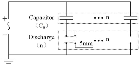 The electrical circuit for the multi-channel gliding arc discharge is shown in Figure 3. Each discharge channel was connected in series with a capacitor (the capacitance value was selected based on the number of discharge channels: 100 pF for six channels and 200 pF for three channels; no capacitor was connected in series for single-channel discharge) and then connected to the high-voltage terminal of the gliding arc power supply.