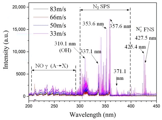 The effect of different inlet velocities on the spectral intensity is shown in Figure 7. The characteristic bands of the N2 Second Positive System (SPS, ), the First Negative System (FNS, ), and NO () are clearly identifiable. Among them, the peak spectral intensities at 310.1 nm, 337.1 nm, 353.6 nm, and 357.6 nm prove the presence of excited states of and . The peak bands at 425.4 nm and 427.5 nm prove the presence of excited states of . The line at 310.1 nm indicates the OH radical, presumably influenced by trace water vapor in the air. Overall, the spectral line intensities in the 200–450 nm wavelength range weaken as the inlet velocity increases. The reason is that the total arc length of the gliding arc decreases with increasing flow velocity, reducing the plasma interaction region between the arc and the gas, which is unfavorable for the generation of excited state particles.