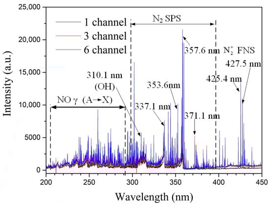 Figure 8 shows the effect of the number of discharge channels on the spectral intensity at an inlet velocity of 50 m/s. The distribution characteristics of the various spectral lines are very similar to those in Figure 7. In contrast, as the number of discharge channels increases, the intensity of the characteristic spectral lines enhances. There are two main reasons: firstly, the increase in the number of channels increases the total arc length of the discharge channels, expanding the interaction area between the arc and the air, ionizing more electrons, and promoting the generation of more excited state particles; secondly, the increase in the number of channels increases the total discharge power of the gliding arc (as known from the electrical characteristics analysis), which favors the generation of more excited state particles.