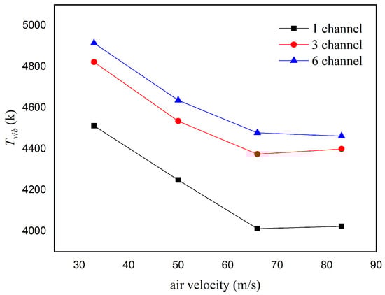 Effect of different inlet velocities and numbers of discharge channels on the vibrational temperature.