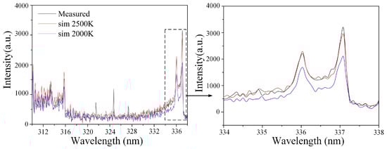 The higher the gas temperature, the better the fuel atomization quality and evaporation rate, and the more readily chemical reactions proceed. Since the rotation-translation relaxation time is extremely short, the rotational temperature of gas molecules in the rotational state is often approximated as the gas temperature around the arc [38]. By setting different rotational temperatures in the plasma spectrum fitting software SPECAIR 3.0 [39], the fitted spectrum (N2 SPS: 310–338 nm) achieved a high degree of overlap with the experimentally collected spectrum. The set rotational temperature was then considered approximately equal to the N2 rotational temperature during the plasma discharge process. Under the same conditions, spectral data were collected and recorded three times, the rotational temperature was fitted for each, and the average was taken as the rotational temperature for that condition. As shown in Figure 10, for single-channel gliding arc discharge at an inlet velocity of 50 m/s, by comparing the fitted curves under different set rotational temperatures with the experimental curve, the highest degree of overlap between the calculated fitted curve and the experimental curve was found within the range of 2000–2500 K. Therefore, the rotational temperature under this condition is determined to be 2000–2500 K.