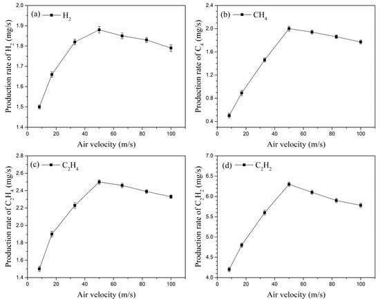 Plasma fuel–air activation experiments were conducted with a fixed kerosene volumetric flow rate of 29 mL/min and an applied three-channel gliding arc discharge, while the inlet velocity was adjusted from 8.3 m/s to 100 m/s (corresponding to an inlet flow rate range of 25 L/min to 300 L/min). Figure 11 shows the variation in the production rates (PR) of the four main cracking products (H2, CH4, C2H4, and C2H2) with the inlet velocity. As the inlet velocity increases, the production rates of these four main components first increase and then gradually decrease, reaching their maximum values at an inlet velocity of 50 m/s. The production rate of H2 increases from 1.5 mg/s at 8.3 m/s to 1.88 mg/s at 50 m/s. When the inlet velocity reaches 100 m/s, the H2 production rate decreases to 1.79 mg/s.