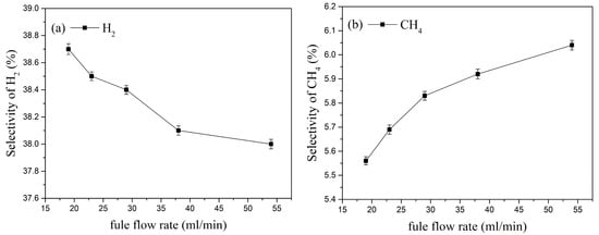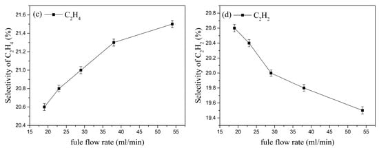 The selectivity of the cracking products under different kerosene flow rates is shown in Figure 15. As the kerosene flow rate increases, the selectivity of H2, CH4, and C2H2 decreases, while the selectivity of C2H4 increases. When the kerosene flow rate increases from 19 mL/min to 54 mL/min, the selectivity of H2 decreases from 38.7% to 38% (a decrease of about 1.84%); the selectivity of C2H4 increases from 20.6% to 21.5% (an increase of about 4.37%); similarly, the selectivity of C2H2 increases by about 5.3%, and the selectivity of CH4 increases from 5.56% to 6.04% (an increase of about 8.63%). This indicates that at the same inlet velocity, increasing the kerosene flow rate raises the fuel-to-air ratio inside the activation actuator, resulting in higher selectivity for C2H4 and CH4.