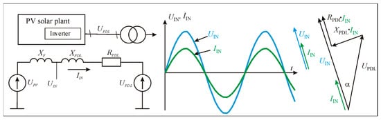 If the power distribution line RPDL is equal to XPDL, then the angle between the PV solar plant inverter voltage and the current φ = 45°. In this case, the reactive power QIN of the PV solar plant inverter must be equal to the active power PIN. In such a situation, the voltage at the point of connection of the PV solar plant inverter to the power distribution lines will be equal to the voltage at the substation and the power transfer from the PV solar plant will take place without any voltage increase.