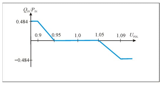 In the case of the second method (Figure 3b), Equation (4) cannot be used directly. In this case, only the active power PIN is known, while neither the reactive power QIN nor the operating point voltage UIN of the PV solar plant inverter connection point to the power distribution lines is known. However, from the linear part of the diagram presented in Figure 4, the coefficient kQ of the dependence of QIN on UIN can be calculated. Based on this coefficient, the detailed characteristic is constructed.