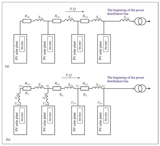 However, the problem of a voltage increase can also be solved by local compensation, when the additional inductance choke is connected only to the connection points of the most remote PV solar plant inverters. Such a situation is shown in Figure 9b, where the voltage increases above the permissible limits only at the end of the line. In this case, the additional inductance chokes are installed only at the connection points of those PV solar plant inverters where a voltage increase is a relevant problem.