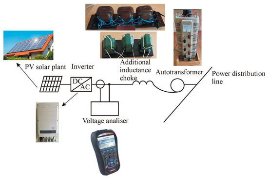 In order to experimentally investigate the operation of a PV solar plant inverter in a grid with additional inductance, a series of experiments using additional grid inductances was performed. The purpose of such an experimental study was to verify whether this can enhance the reactive power response of the inverter and improve voltage compensation. The experimental verification of the results of Section 6 is quite complicated. This would require sophisticated equipment. A simpler variant—one PV solar power plant—was chosen for experimental verification. Voltage surges and drops in power distribution lines are simulated by reducing and increasing the line voltage with an autotransformer. Such experiments also show the dynamics of the inverter operation when the load or voltage suddenly changes, thus complementing the results of Section 6. The experiment used a 10 kW “Solaredge” inverter with connected photovoltaic cells, a TSGC2-15 type autotransformer (Wenzhou Wosn Electron Technology, Wenzhou, China), a voltage quality analyzer MI 2892 (Metrel, Horjul, Slovenia), and additional inductive chokes. All experimental equipment was connected to the laboratory power distribution lines (Figure 12). It is measured using the regulation function QIN = f(UPDL), when the voltage equal to the nominal reactive power was not generated or consumed. When the voltage was changed by the autotransformer, the voltage change in the power distribution lines was simulated; the regulation function started to work and the reactive power became non-zero.
