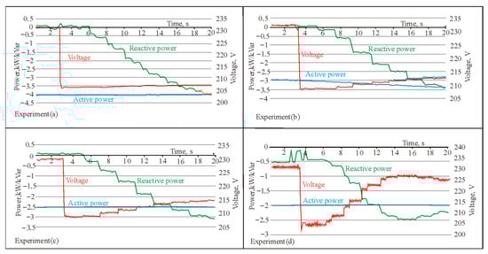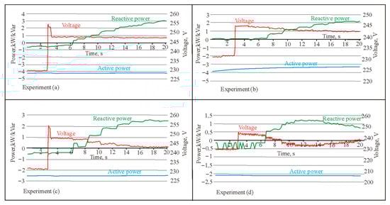The experimental results, presented in Figure 13, show that, when the voltage in the power distribution lines decreases, the voltage at the point of connection of the PV solar plant to the line also decreases at the beginning, but then begins to increase due to the increased reactive power Q. The reactive power Q reaches the same values as the active power P, and, in some cases, even exceeds it. The dependence of the increase in voltage V1–V3 on the additional inductance of the line is clearly visible: if, in experiment (a), the voltage increases by only a couple of volts, then, in experiment (d), the voltage increases so much that it compensates for almost half of the entire initial drop. Thus, the effect of the additional inductance is obvious.