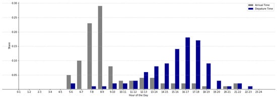 In the following subsection, the evaluation of the 37,238 parking and charging events for the STU, KAR, and NWH locations are presented and discussed. Figure 1 shows the percentage distribution of arrival and departure times within a day over the year 2023. The percentage values are depicted for each hour between 0 and 24 on the horizontal axis. Each hour starts on the hour and ends 59 min after the start of the hour. For example, the first hour begins at 0:00 and ends at 0:59.
