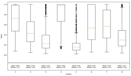 The longest charging durations are dominated by the relatively smallest Cluster groups 6 and 3 (on average 05:15 and 04:48 h, respectively). On average, 65% of charging operations (charging duration) are completed in 3 h and 57 min for Cluster groups 8, 5, 2, and 7. Cluster groups 1 and 4 represent the group with the shortest average charging duration, which is 2 h and 31 min. Table 5 illustrates the average charging time () alongside the standard deviations () and medians ().