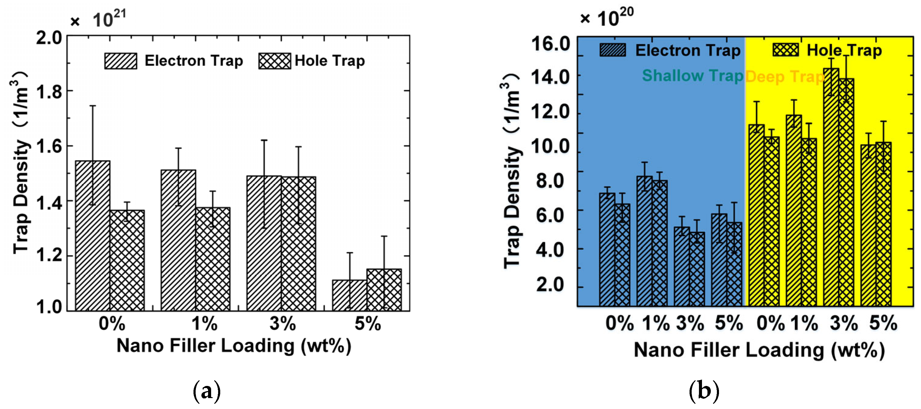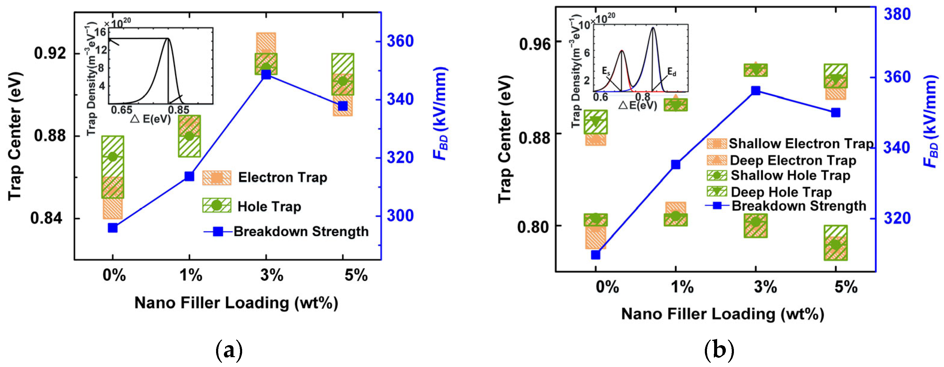 - Li, S.; Min, D.; Wang, W.; Chen, G. Linking traps to dielectric breakdown through charge dynamics for polymer nanocomposites. IEEE Trans. Dielectr. Electr. Insul. 2016, 23, 2777–2785. [Google Scholar] [CrossRef]