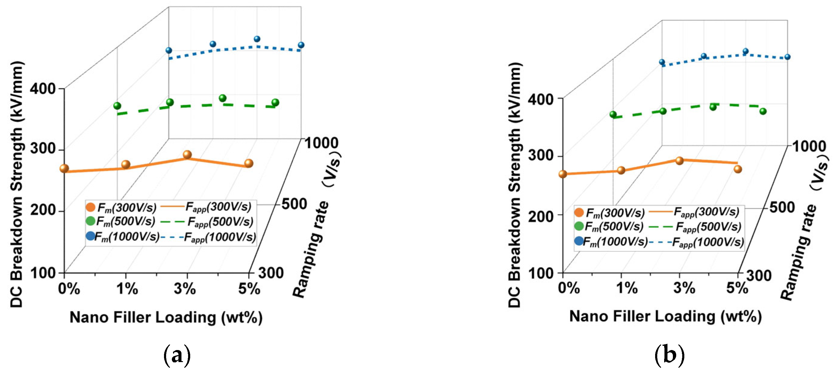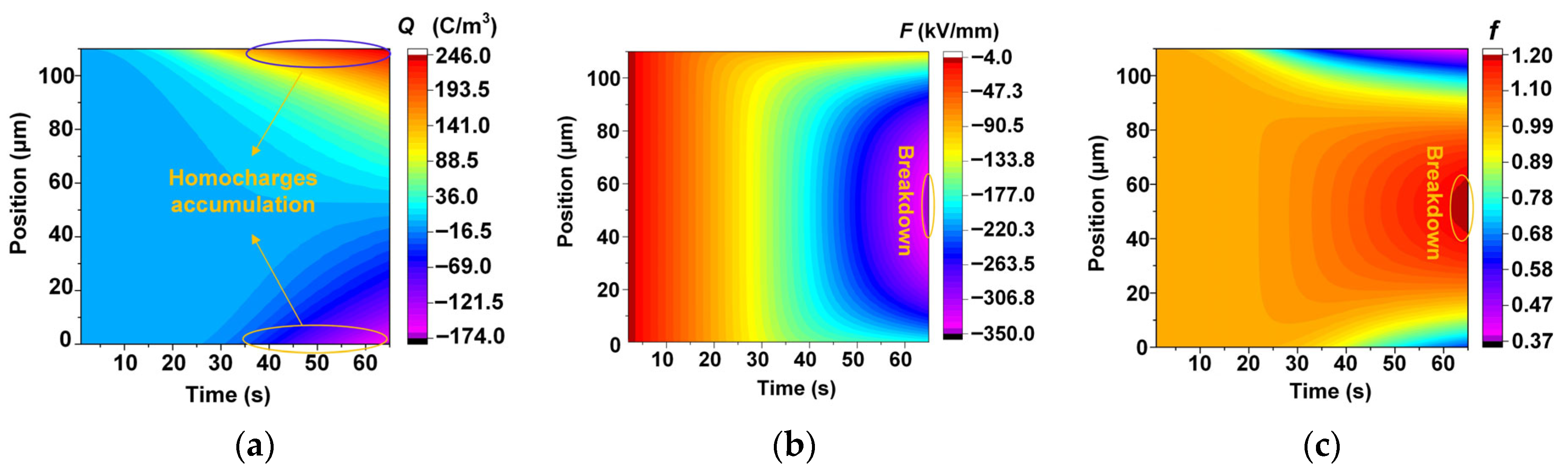 - Li, S.; Min, D.; Wang, W.; Chen, G. Modelling of dielectric breakdown through charge dynamics for polymer nanocomposites. IEEE Trans. Dielectr. Electr. Insul. 2017, 23, 3476–3485. [Google Scholar] [CrossRef]