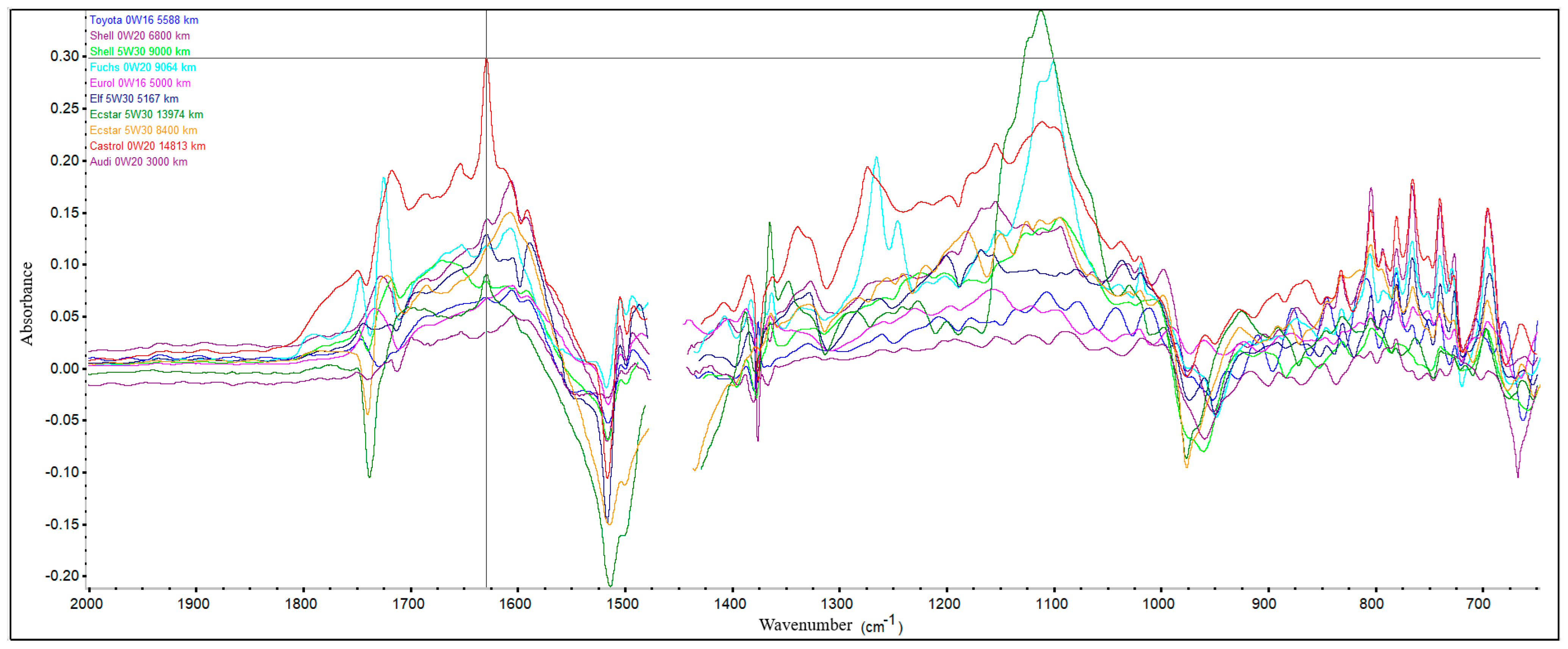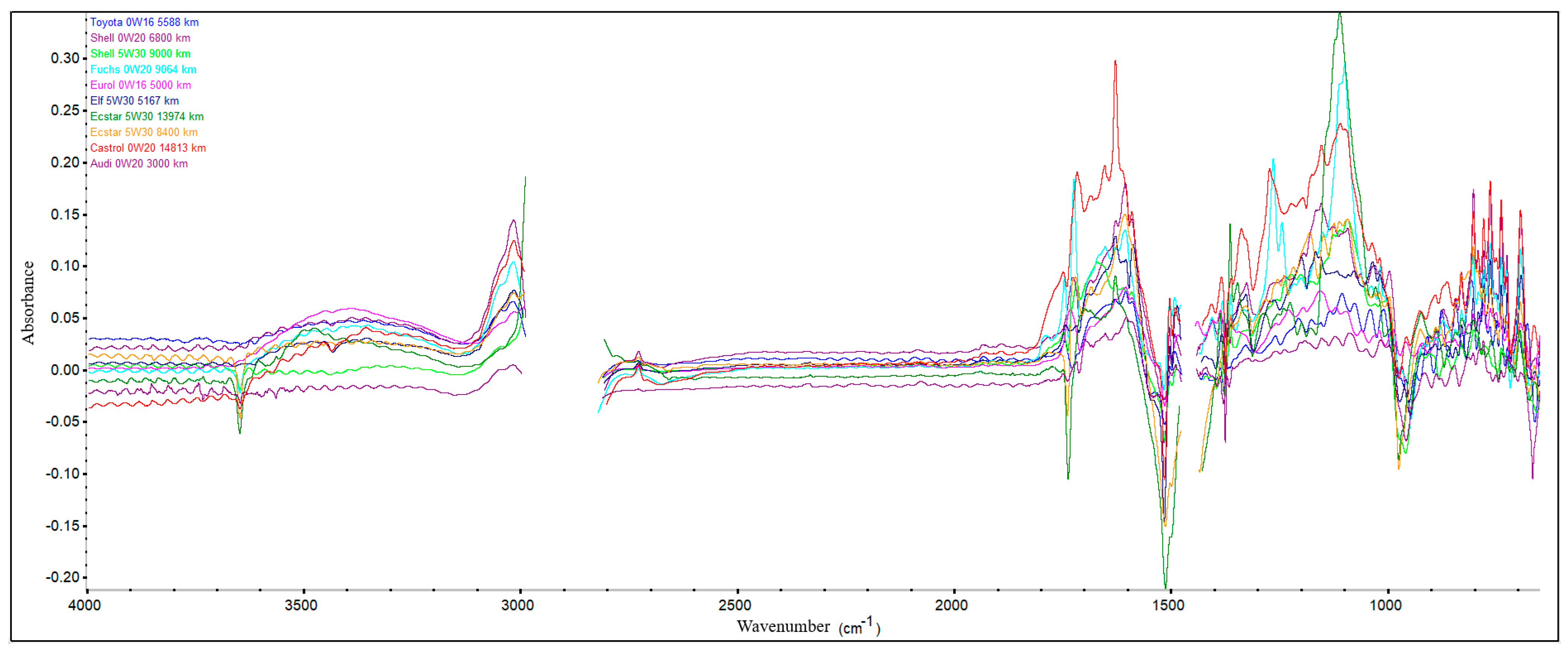 FTIR analysis revealed clear differences in the degradation mechanisms across the examined oil samples, reflecting both the operating conditions of the engines and the specific pathways of lubricant ageing. The strongest nitro-oxidative signals were observed for Castrol 0W20 (14,813 km), as indicated by the high intensity of the nitration band at 1630 cm−1 and pronounced oxidation peaks in the 1727–1747 cm−1 region. This sample also exhibited the highest level of contamination in the 3000–3600 cm−1 range and a distinct fuel-related signal, accompanied by a major reduction in viscosity. These combined effects suggest simultaneous fuel dilution, oxidation, and additive degradation, which is consistent with the operating pattern of an engine frequently subjected to cold starts and short-distance driving. A comparable pattern of oxidation and clear indications of fuel dilution was also detected for Fuchs 0W20 (9064 km). This sample demonstrated a substantial drop in viscosity and strong absorption in the 3000–3100 cm−1 region, confirming the presence of fuel. At the same time, the oxidation band around ~1700 cm−1 was notably intensified, consistent with the high-temperature stress experienced by small turbocharged engines operating under rapidly varying loads. Elevated nitro-oxidation levels were also observed in Elf 5W30 (5167 km), Shell 0W20 (6800 km) and Ecstar 5W30 (13,974 km). These oils share a common pattern of predominantly urban operation, characterised by short trips and delayed attainment of full operating temperature. The increase in nitration intensity suggests suboptimal combustion during the initial phase of engine warm-up, which promotes the transfer of combustion by-products into the lubricant. This agrees with moderate viscosity losses, although the effect is markedly weaker than in Castrol and Fuchs. Fuel-related signals in the ~800 cm−1 and 3000–3600 cm−1 regions were clearly visible for Castrol 14,813 km, Fuchs 9064 km, Shell 6800 km, Elf 5167 km, Toyota 0W16 (5588 km) and Eurol 0W16 (5000 km). In the Toyota and Eurol samples, the amplitude was significantly lower, which is consistent with the moderate viscosity decrease and the more stable, low-load operating conditions of their engines.