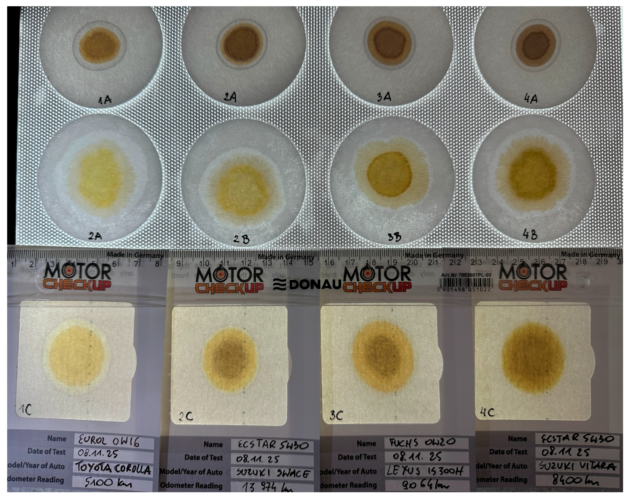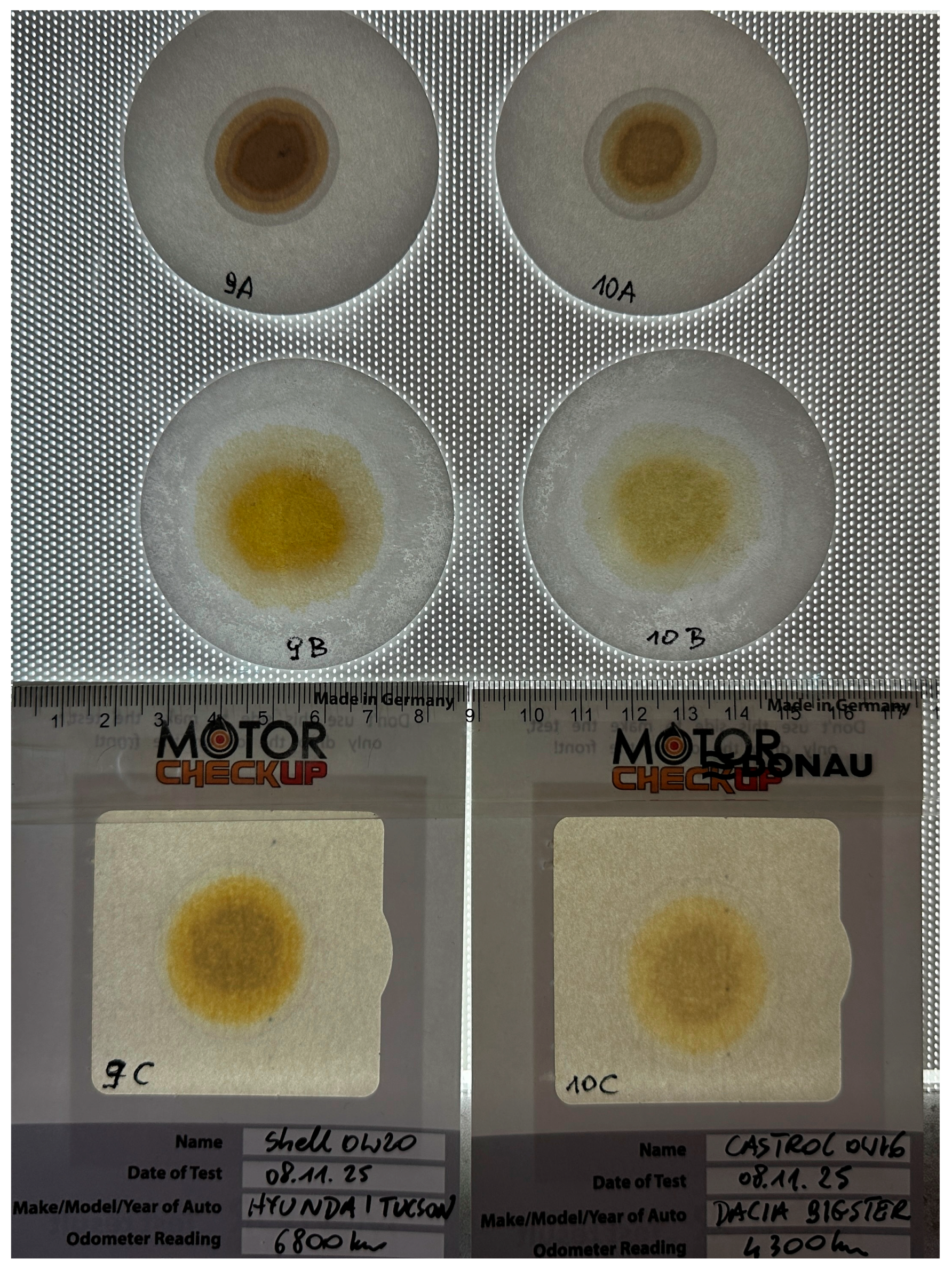 Paper chromatography was applied as a complementary diagnostic technique to visualise dispersion quality, contamination patterns and potential fuel-related effects in the oils. Two types of filter media were used: (1) paper developed using original laboratory formulations, optimised for enhanced separation of central and peripheral zones, and (2) professional chromatographic paper supplied by MCU (Motor Check Up, Birstein, Germany), designed specifically for engine oil spot testing. The in-house papers were selected for their increased hydrophilicity and improved migration uniformity, which enable clearer differentiation between the dark central deposit zone, the diffusion ring and the outer oxidative halo. The MCU paper, characterised by a more controlled capillary structure and higher reproducibility, served as the reference material to ensure comparability between samples. A fixed droplet volume of each oil was deposited onto the paper surface and allowed to develop under controlled ambient conditions until migration ceased. The resulting chromatograms were evaluated qualitatively, focusing on ring structure, distribution of insolubles, halo intensity and overall spot morphology. In hybrid engines, the presence of volatile fuel components typically influences the relative expansion of the diffusion zone and alters the sharpness of the central deposit area; thus, chromatographic patterns provided additional insight into the degree of dilution and the general stability of the lubricant.