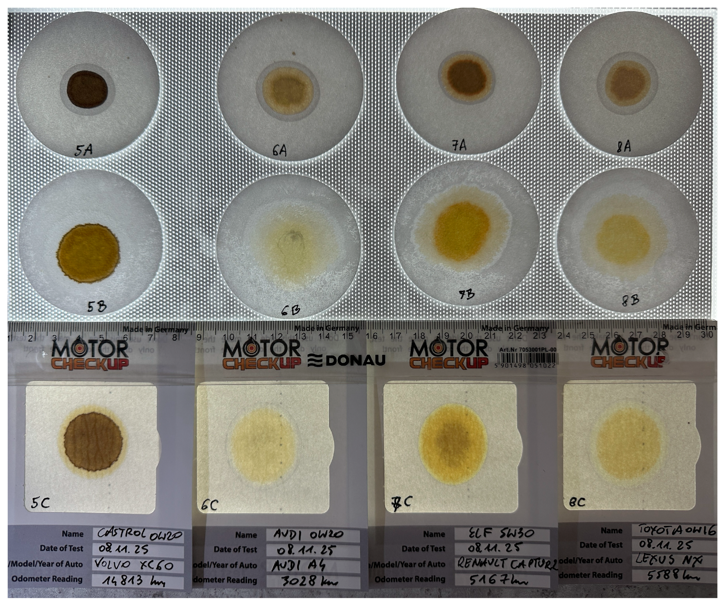In the case of the Castrol 0W20 oil (14,813 km), the blot test (all three blots) is characterised by a distinct, clearly outlined dark core. Additionally, two of the blots exhibit a non-uniform, partially “ragged” contour around the central zone, which suggests phase separation and advanced degradation processes. On blot 5B, a broad, sharply defined outer ring is also observed—a transparent halo located beyond the typical diffusion region. Such an outer halo, clear and uniformly shaped, may indicate the migration and evaporation of volatile components present in the heavily degraded oil, including the potential contribution of fuel fractions. This morphology is fully consistent with the chemical results: the FTIR spectrum revealed the strongest fuel-related band in the entire dataset at approximately ~800 cm−1, together with pronounced nitro-oxidation features and a high level of overall contamination (3000–3600 cm−1). The sample also exhibited the most severe viscosity loss, confirming advanced physicochemical degradation. This suggests that the observed outer halo results from the combined effect of oxidative-nitro degradation and fuel dilution, which promotes the migration and evaporation of light hydrocarbons beyond the standard diffusion zone.