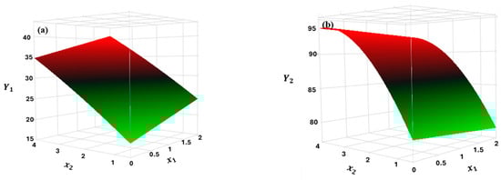 Figure 3. Response surface for (a) Y1 and (b) Y2 as a function of x1 and x2.