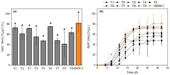 The effluent pretreated through different Fenton process conditions was subjected to BMP testing to quantify the maximum methane production of the substrate under anaerobic conditions. The tests were conducted with a substrate-to-inoculum ratio (SIR) equal to 1, as recommended by Vaz et al. [11] for the same effluent (OMW-1). Figure 4a,b show the BMP results after 32 days and the specific methane production (SMP), respectively, for the different pretreatment conditions tested.