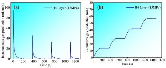 For the H4 formation experiment, the simulated formation pressure was set at 15 MPa with a confining pressure of 18 MPa, and an initial pressure equilibrium period of 7 h was implemented. The formation pressure was maintained at 15 MPa. Subsequently, the wellhead back pressure was gradually reduced from 12 MPa to simulate the production process. Instantaneous and cumulative gas production rates were systematically recorded following each 3 MPa reduction in pressure. The resulting production data are comprehensively presented in Figure 2.