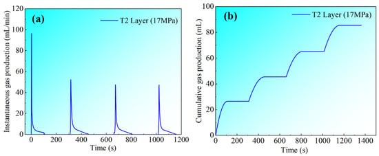 For the T2 formation experiment, the simulated formation pressure was set to 17 MPa with a confining pressure of 20 MPa, and an initial pressure equilibrium period of 4 h was implemented. Subsequently, the wellhead back pressure was gradually reduced from 12 MPa for the gas layer exhibiting a formation pressure of 17 MPa. Instantaneous and cumulative gas production rates were systematically recorded following each 3 MPa reduction in pressure. The resulting production data are comprehensively presented in Figure 4.