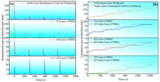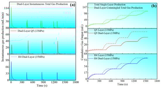 Figure 5a demonstrates that, compared to single-layer production conditions (See Figure 2 and Figure 3), both the instantaneous and cumulative gas production rates for the two layers in the commingled production system exhibited varying degrees of reduction. Notably, the production peak of the Q5 formation (low-pressure layer) consistently occurred later than that from the H4 formation (high-pressure layer), exhibiting a distinct “staggered peak production” phenomenon. This temporal misalignment is a direct manifestation of dynamic interlayer interference. The high-pressure layer (H4) rapidly establishes a pressure depletion zone upon well opening due to its inherent pressure advantage, leading to an early production peak. In contrast, the low-pressure layer (Q5) requires an extended period to develop an effective production pressure differential, resulting in a significantly delayed production peak. Under single-layer production conditions, the peak instantaneous gas production rates for the 15 MPa and 13 MPa layers were 97.32 mL/min and 30.59 mL/min, respectively, underscoring the significant influence of formation pressure on production capacity. In the commingled production scenario, this disparity became more pronounced. During the initial phase of two-layer commingled production, the instantaneous gas production from the high-pressure layer (15 MPa) was significantly greater than that from the low-pressure layer (13 MPa) due to its inherent pressure advantage. Notably, the instantaneous production from the low-pressure layer was zero initially, revealing a typical ‘inversion’ phenomenon. Specifically, the average instantaneous gas production rate for the Q5 formation (the relatively low-pressure layer) decreased from 47.3 mL/min to 42.12 mL/min, representing a reduction of 10.94%. In contrast, the average instantaneous gas production rate for the H4 formation (the relatively high-pressure layer) decreased marginally from 56.9 mL/min to 56.62 mL/min, a reduction of only 0.65%. This indicates a significant inhibitory effect exerted by the high-pressure layer on the production capacity of the low-pressure layer. Further observations indicated that during identical depressurization stages, the peak gas production from the Q5 formation consistently occurred later than that from the H4 formation, exhibiting a distinct “staggered peak production” phenomenon. As the production process advanced, the temporal offset between the two peaks within each stage progressively widened, demonstrating that the interlayer interference effect intensifies over time.