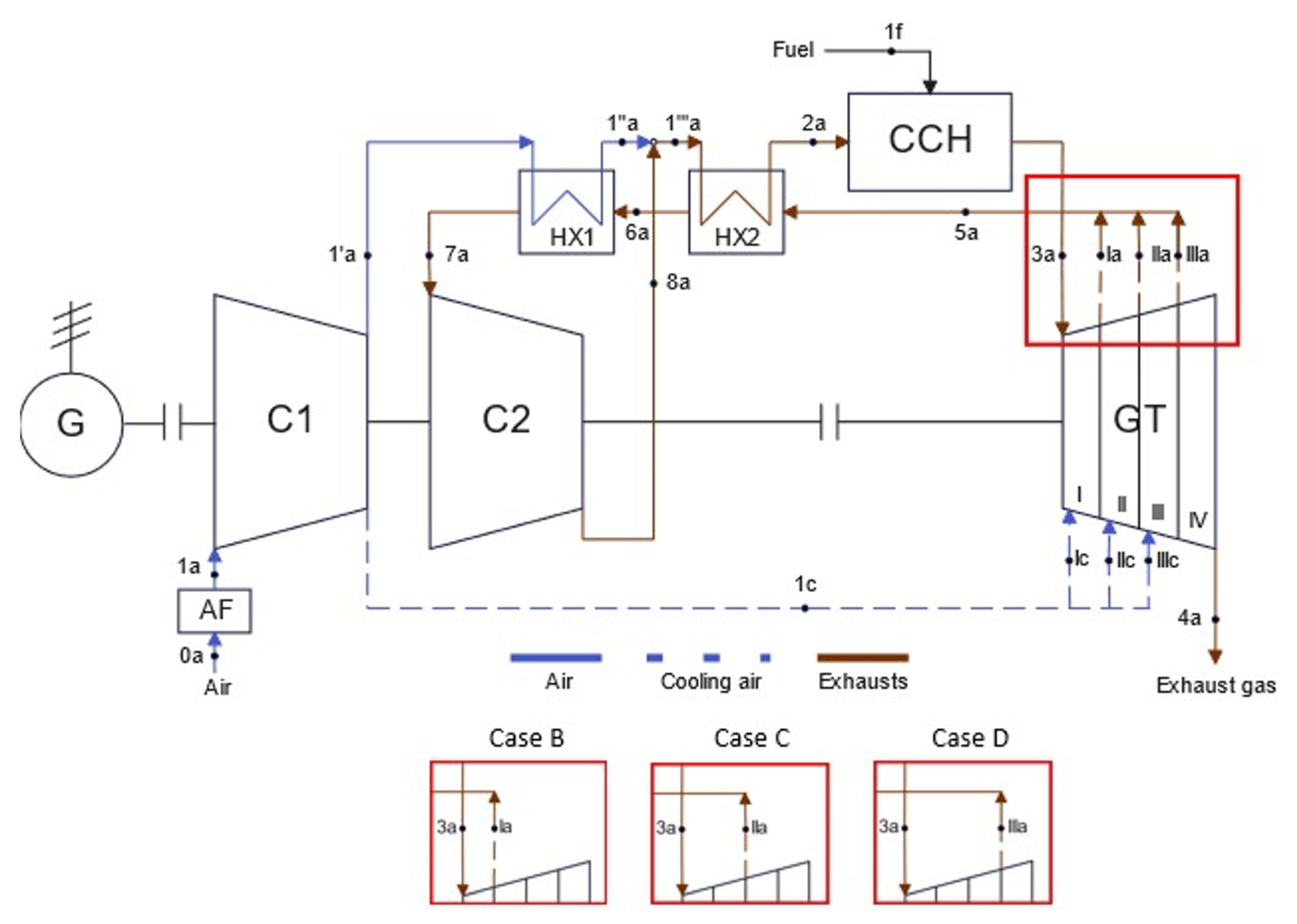 Increasing the electrical efficiency of a gas turbine can also be achieved by employing interstage cooling of compressed air. Lowering the temperature of the compressed air reduces the power consumed by the compressor, theoretically resulting in increased efficiency. However, reducing the temperature of the air before it enters the combustion chamber leads to an increase in the amount of fuel supplied to the combustion chamber to achieve a higher temperature of the resulting exhaust gases. In this case, it is justified to use additional heat regeneration to increase the temperature of the air before it enters the combustion chamber [