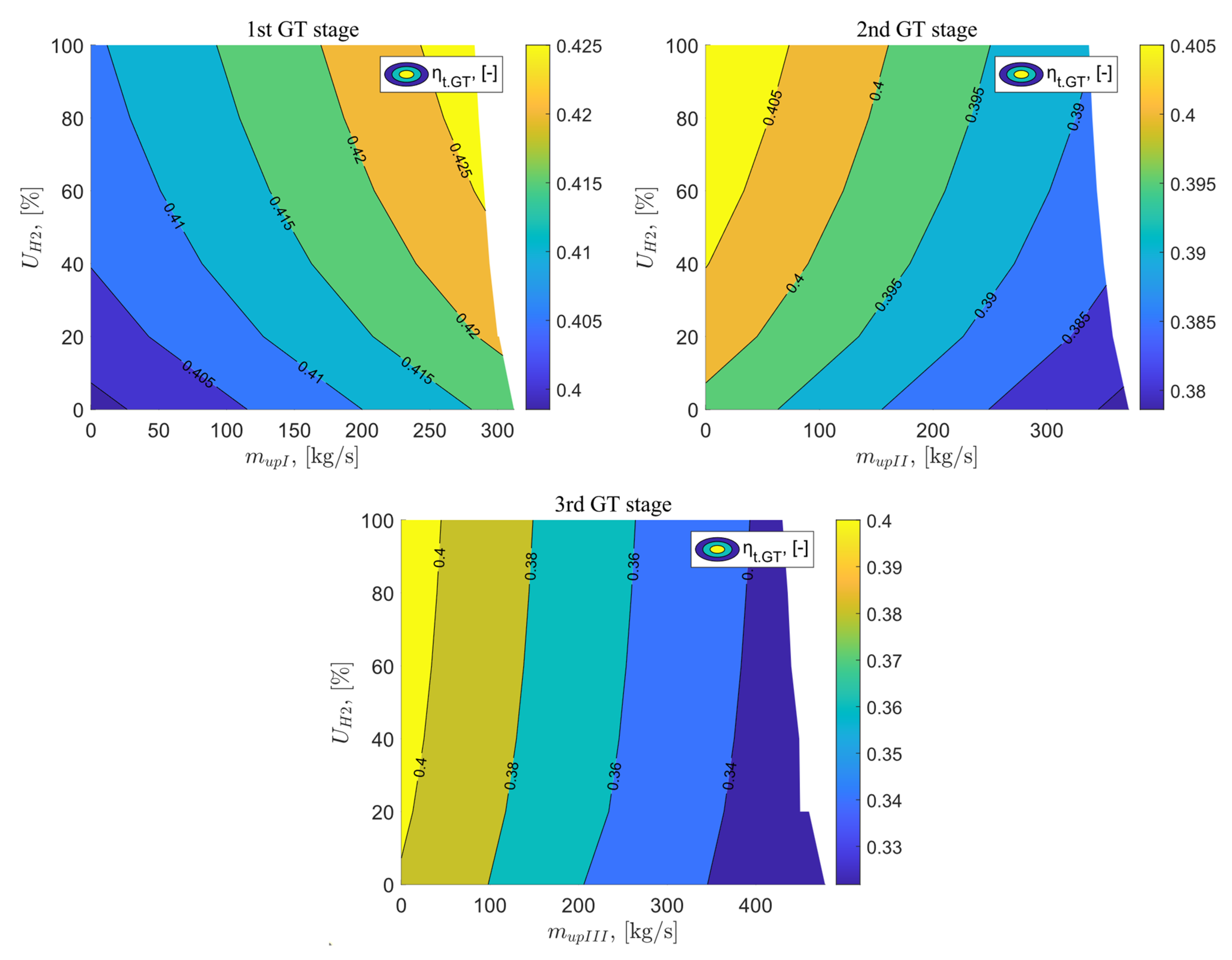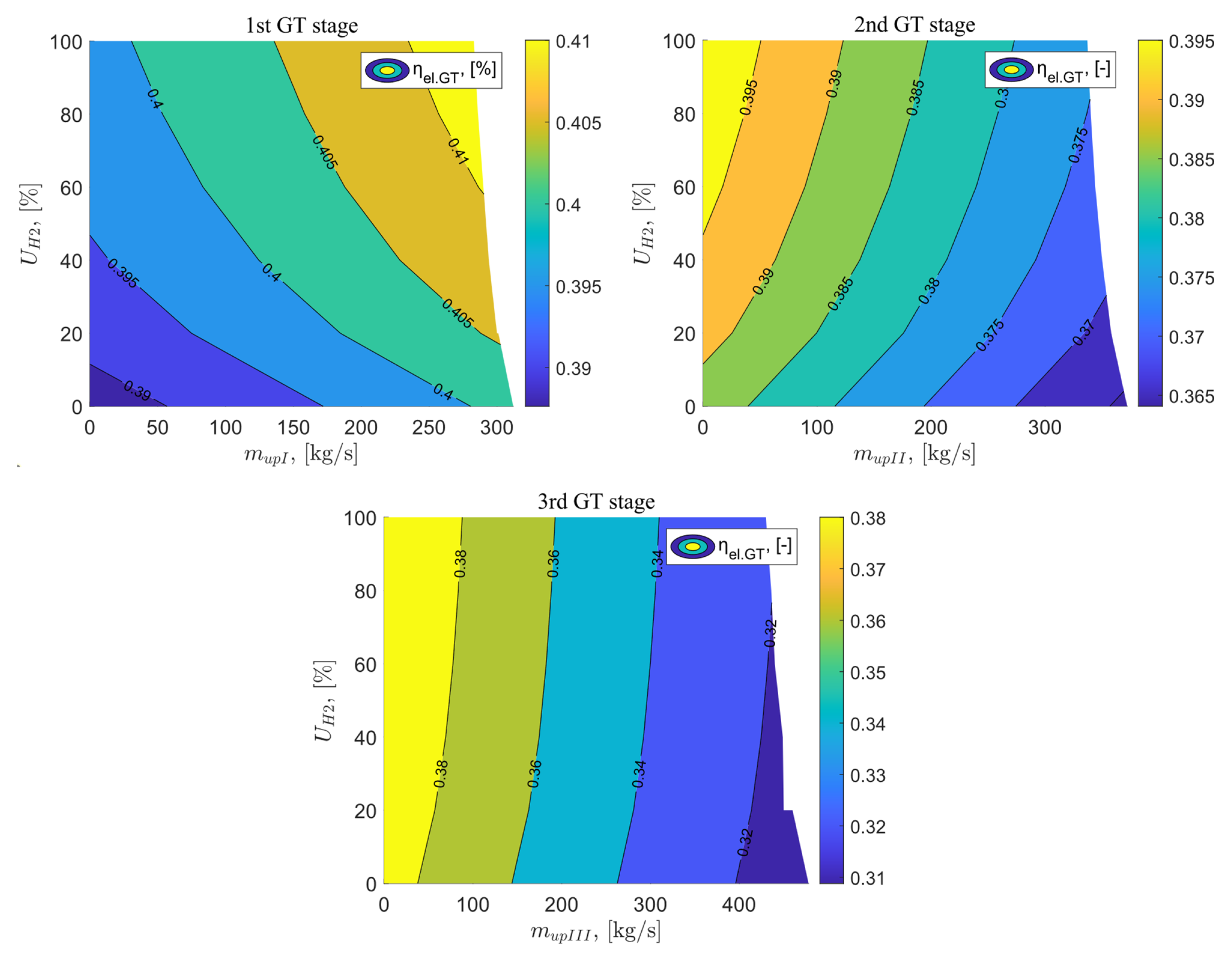 The results of the analysis for the electric efficiency of the gas turbine as a function of the exhaust vent after the I, II, and I stages of the gas turbine, as well as the percentage share of hydrogen in the fuel mixture are presented in