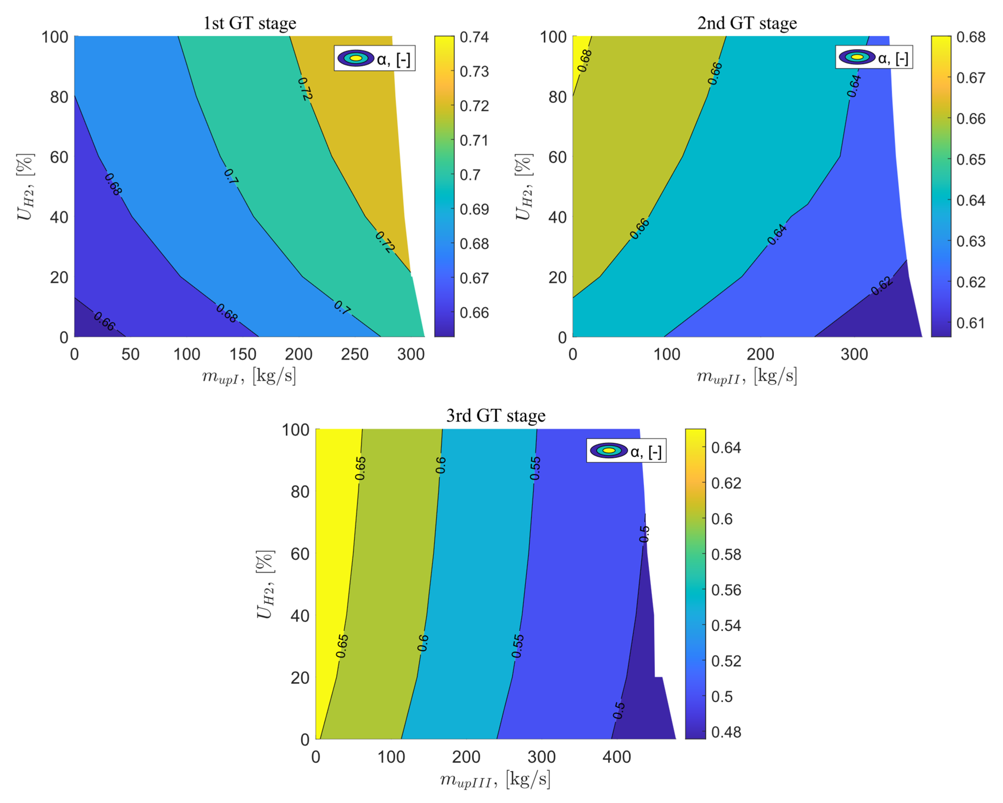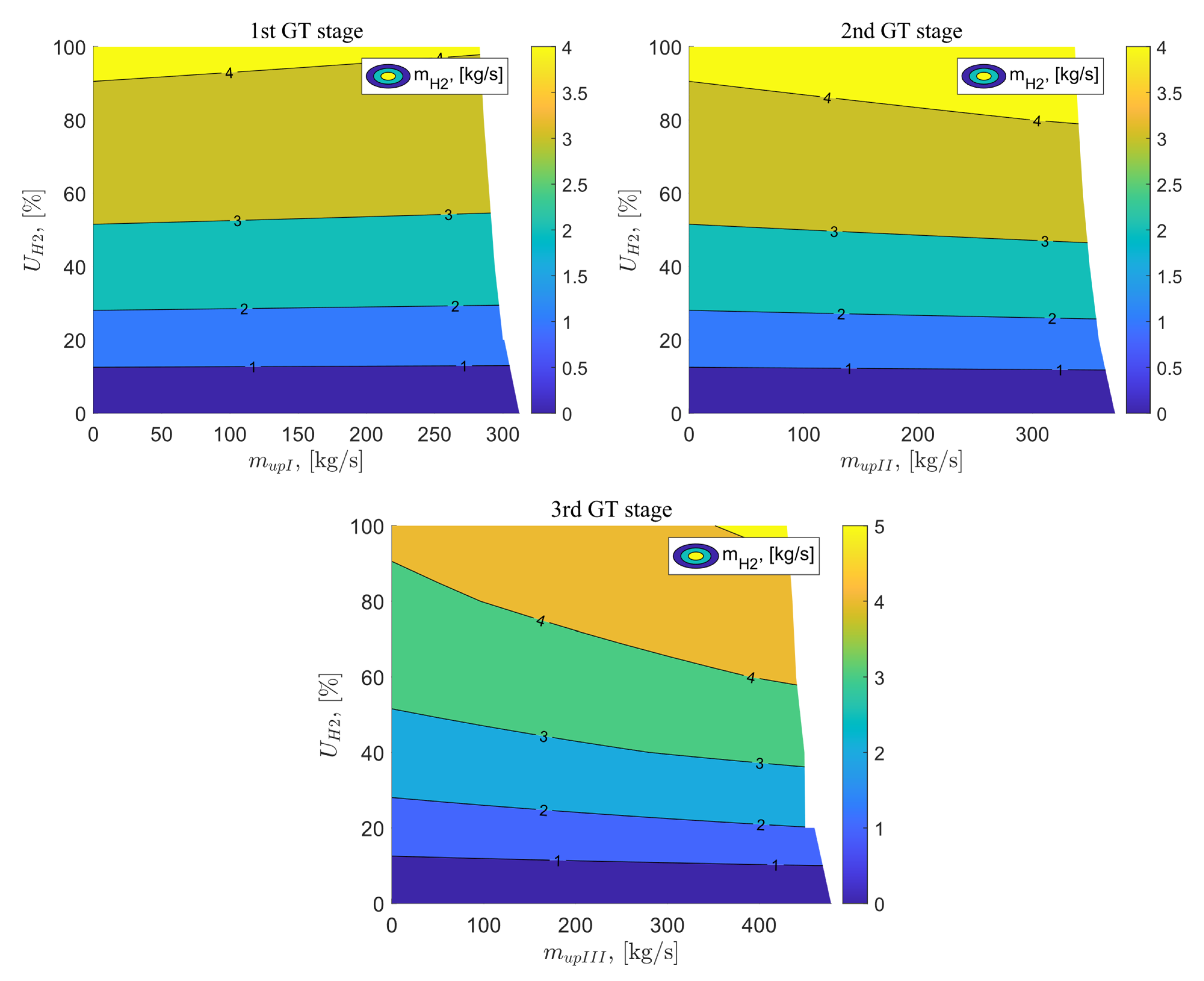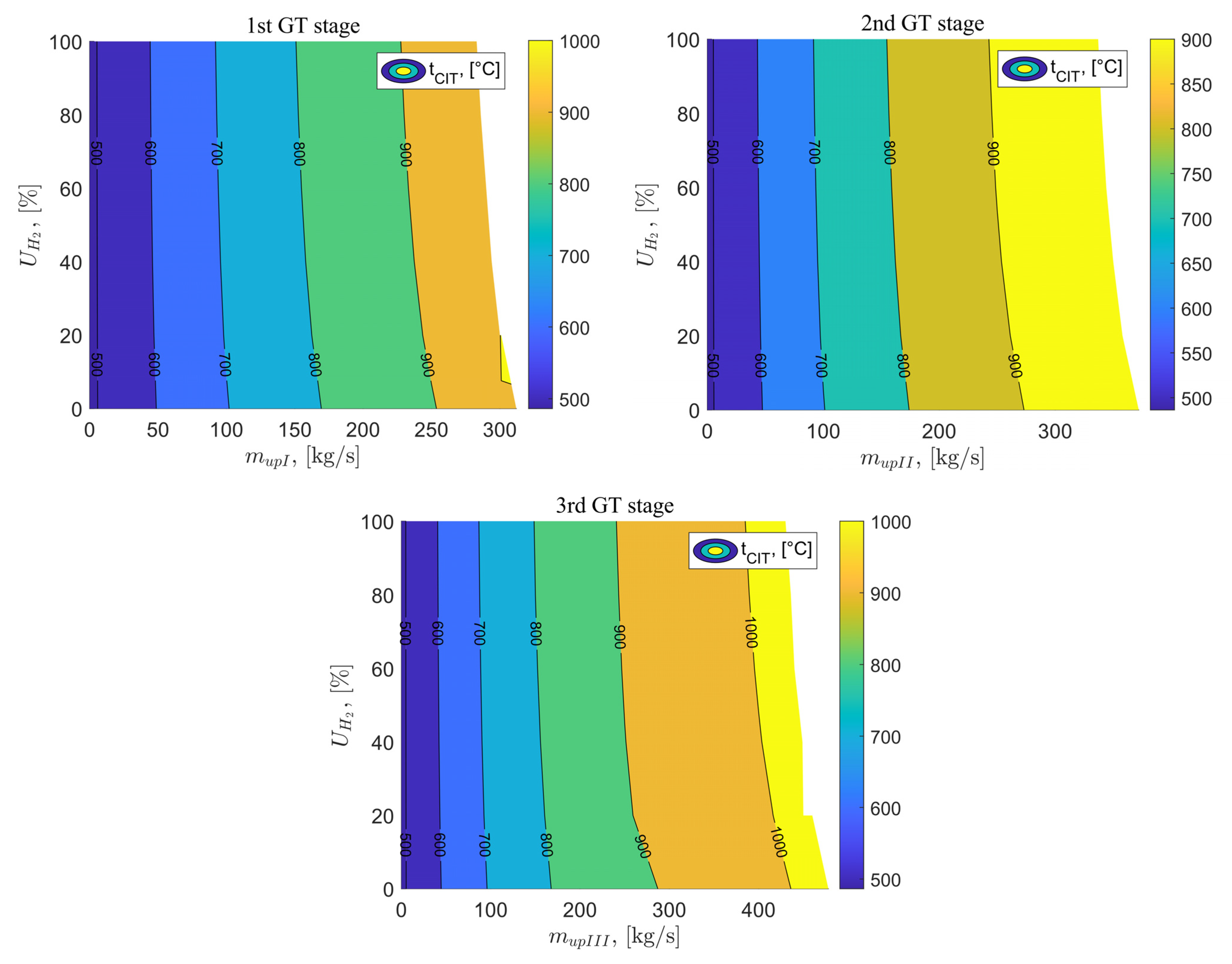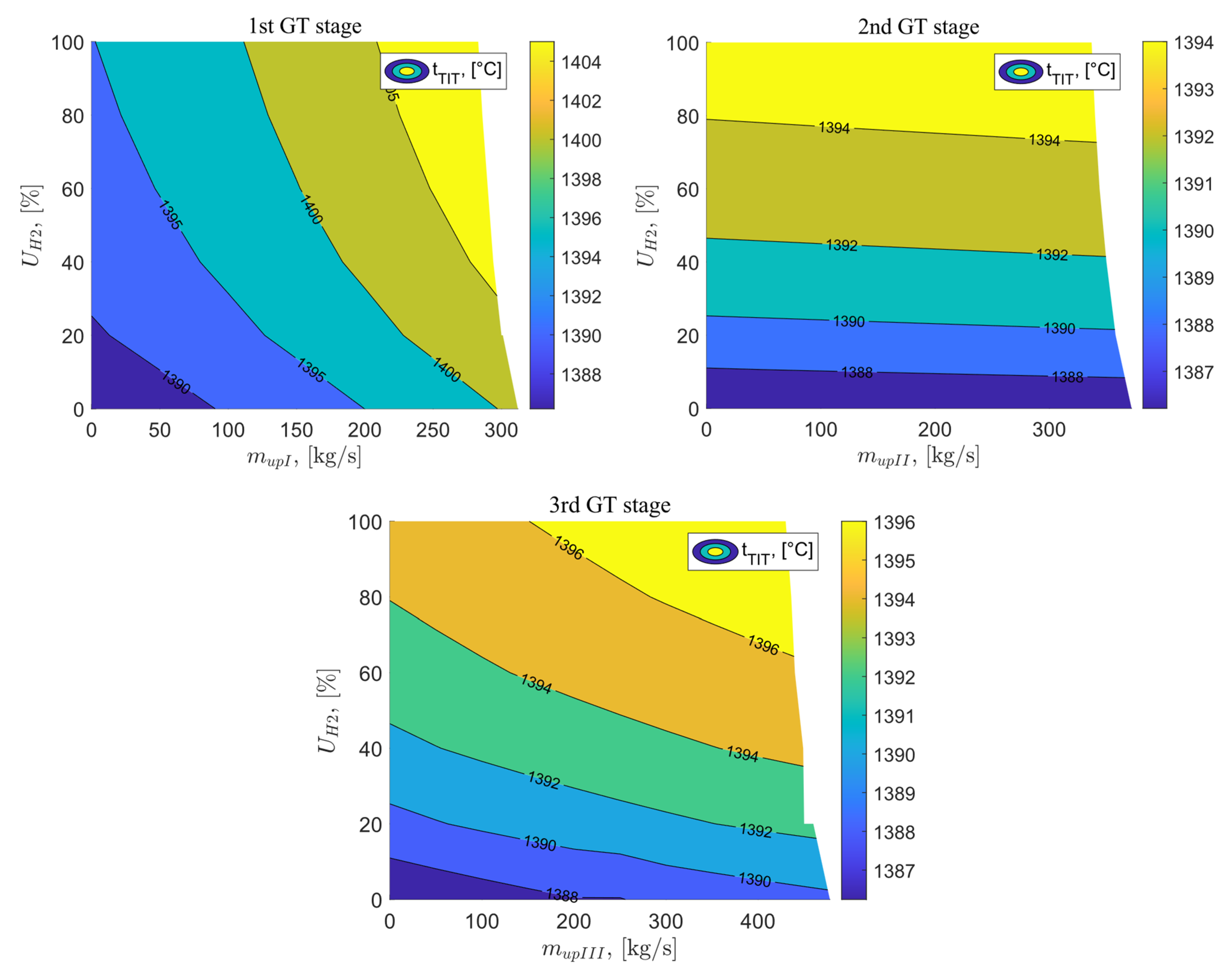 Figure 8 shows the analysis results for the TIT temperature as a function of exhaust vent flow after the I, II, and III stages of the gas turbine and the percentage share of hydrogen in the fuel mixture.