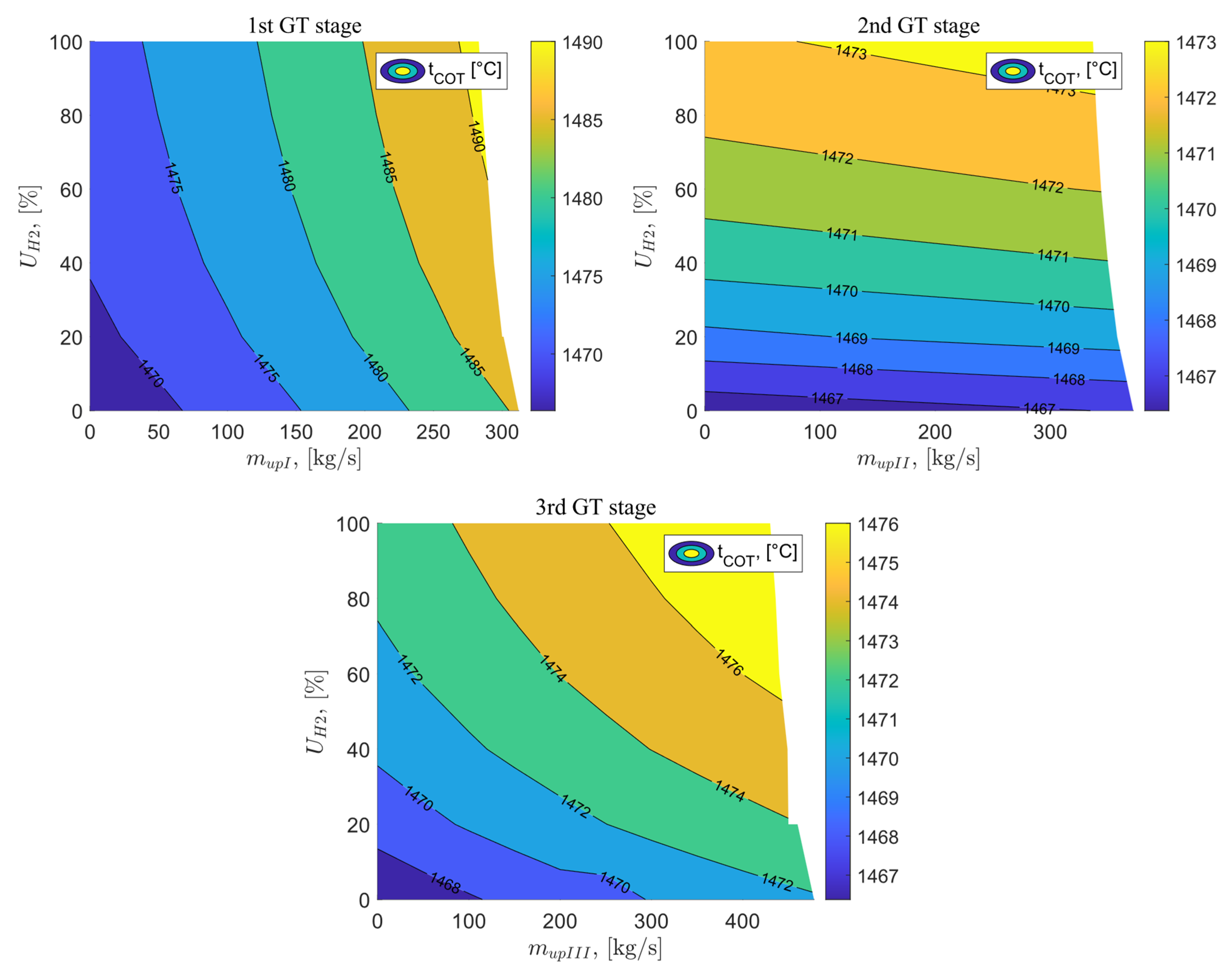 = 100%. As a result of using exhaust vent after the III stage of the gas turbine, the highest possible temperature is 1023.43 °C and was achieved for an exhaust gas flow rate of 436 kg/s and a hydrogen percentage in the fuel mixture of 80%.