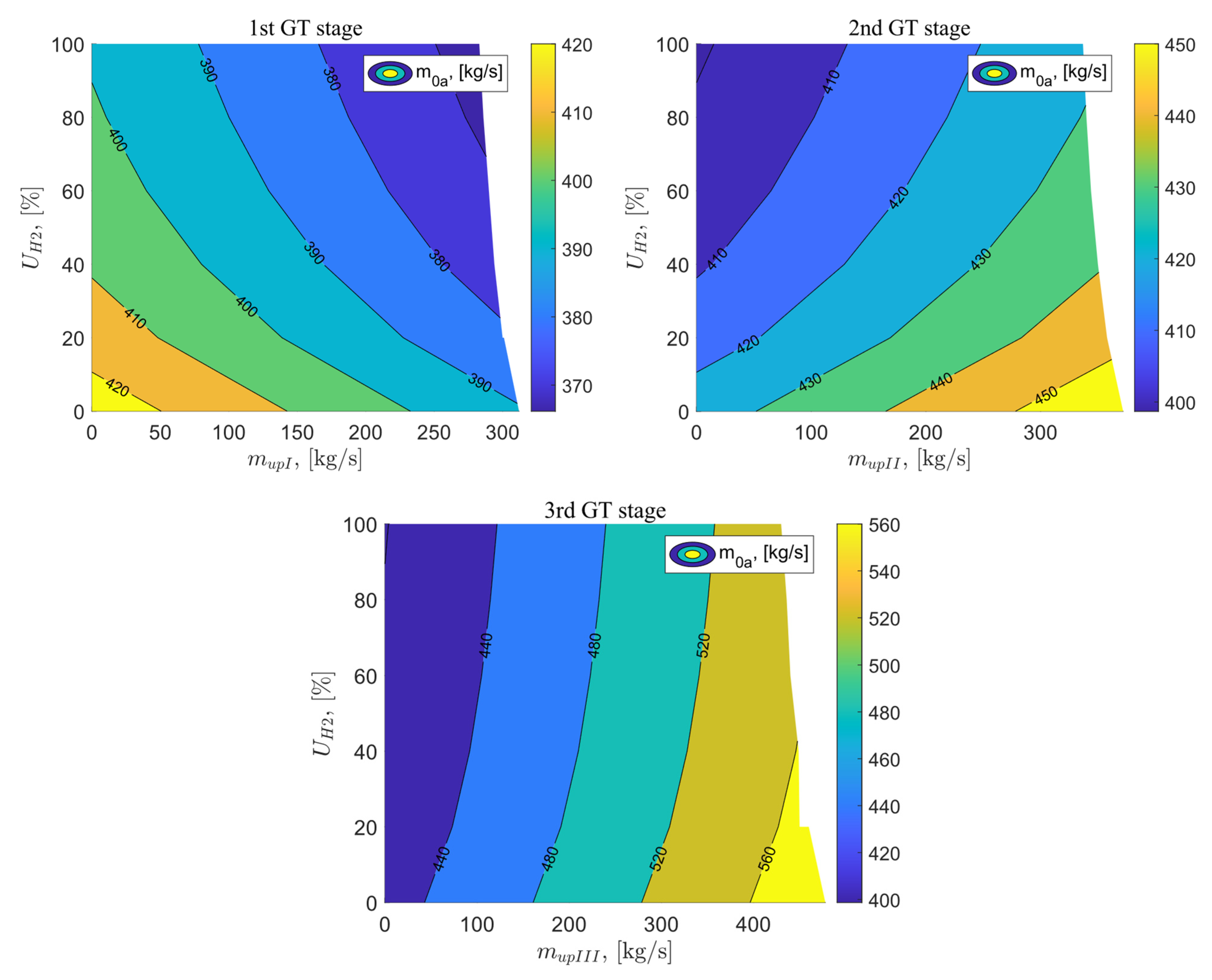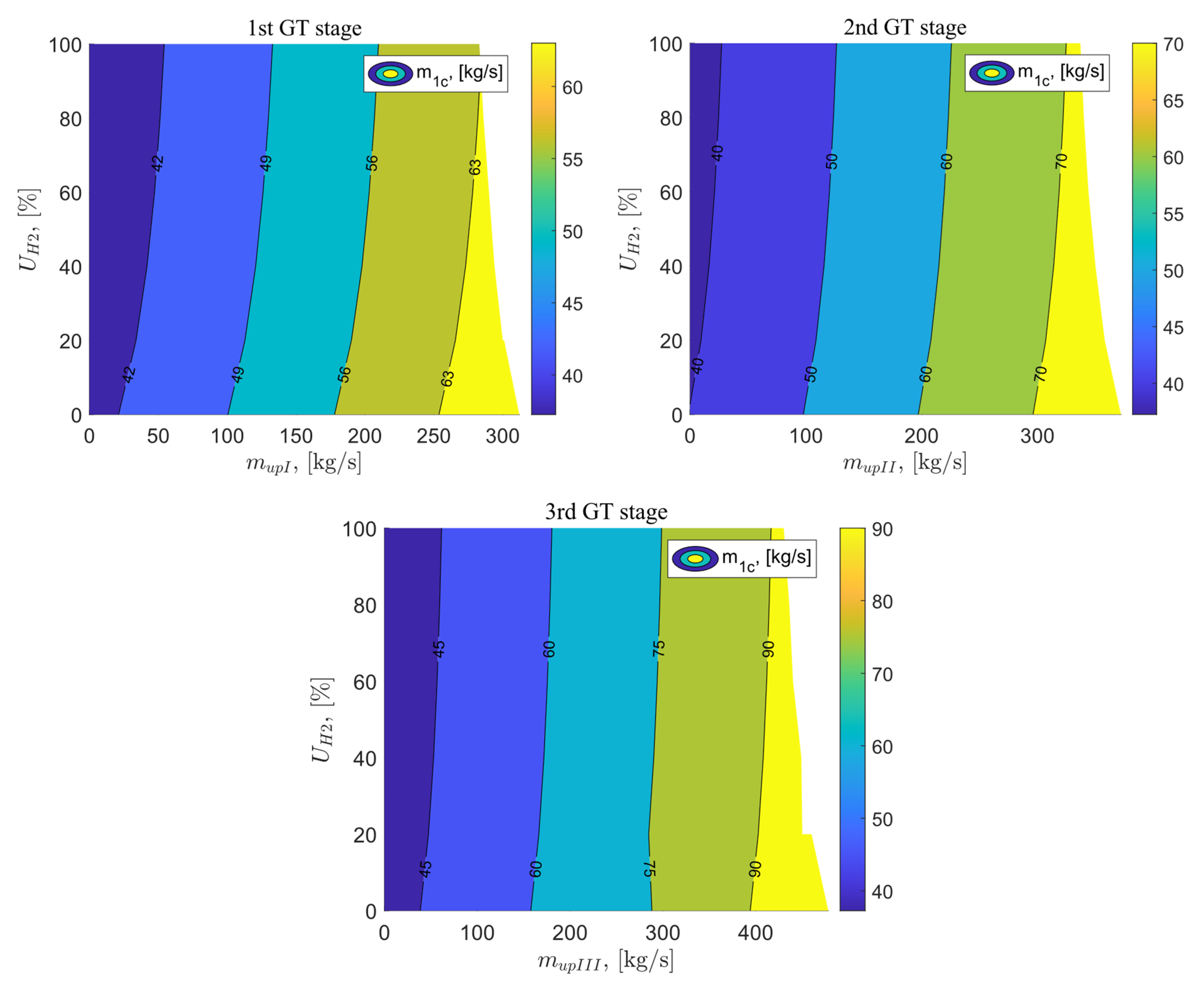 Figure 6 shows the analysis results for the CIT temperature as a function of the exhaust flow rate after the I, II, and III stages of the gas turbine and the percentage of hydrogen in the fuel mixture.