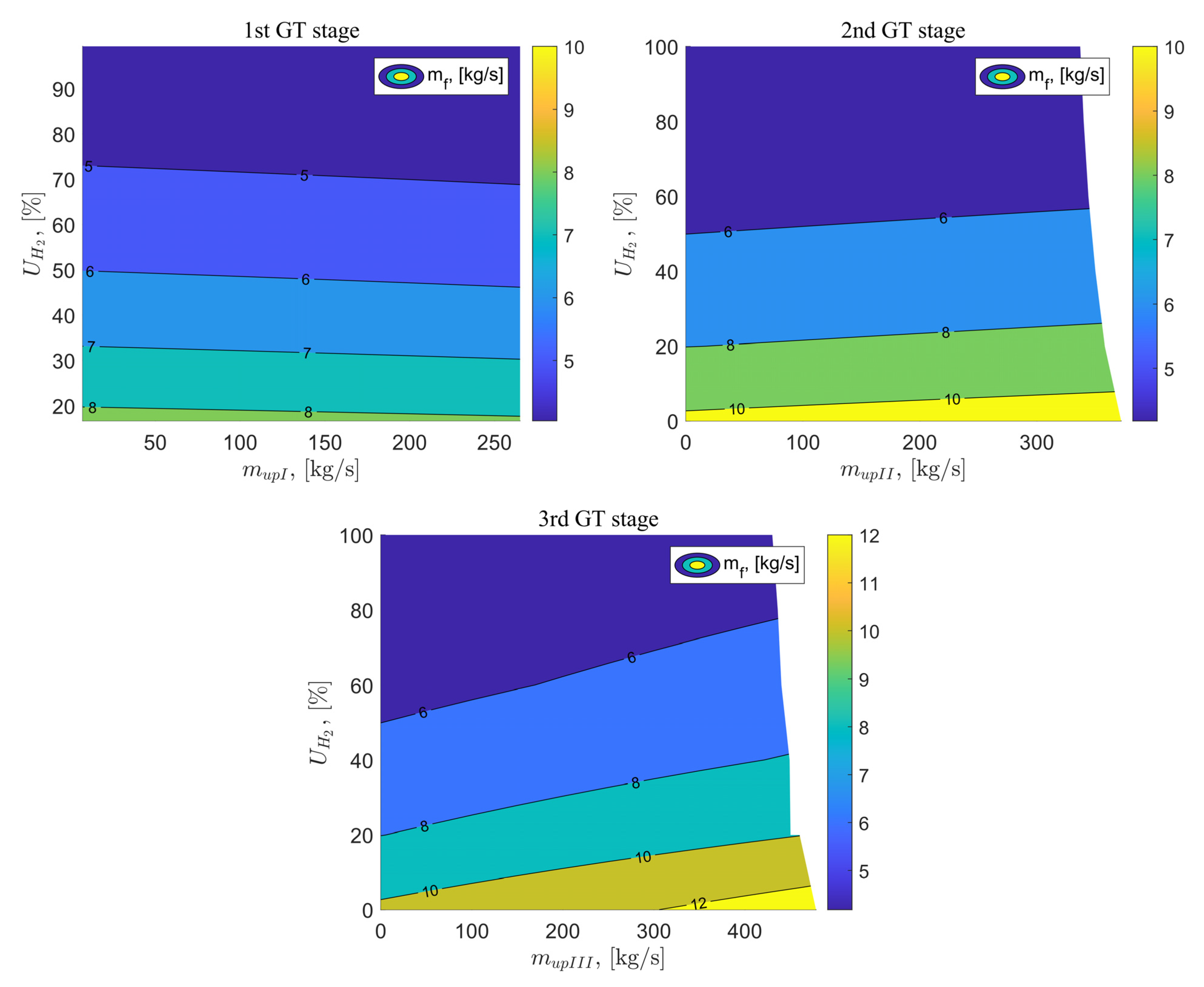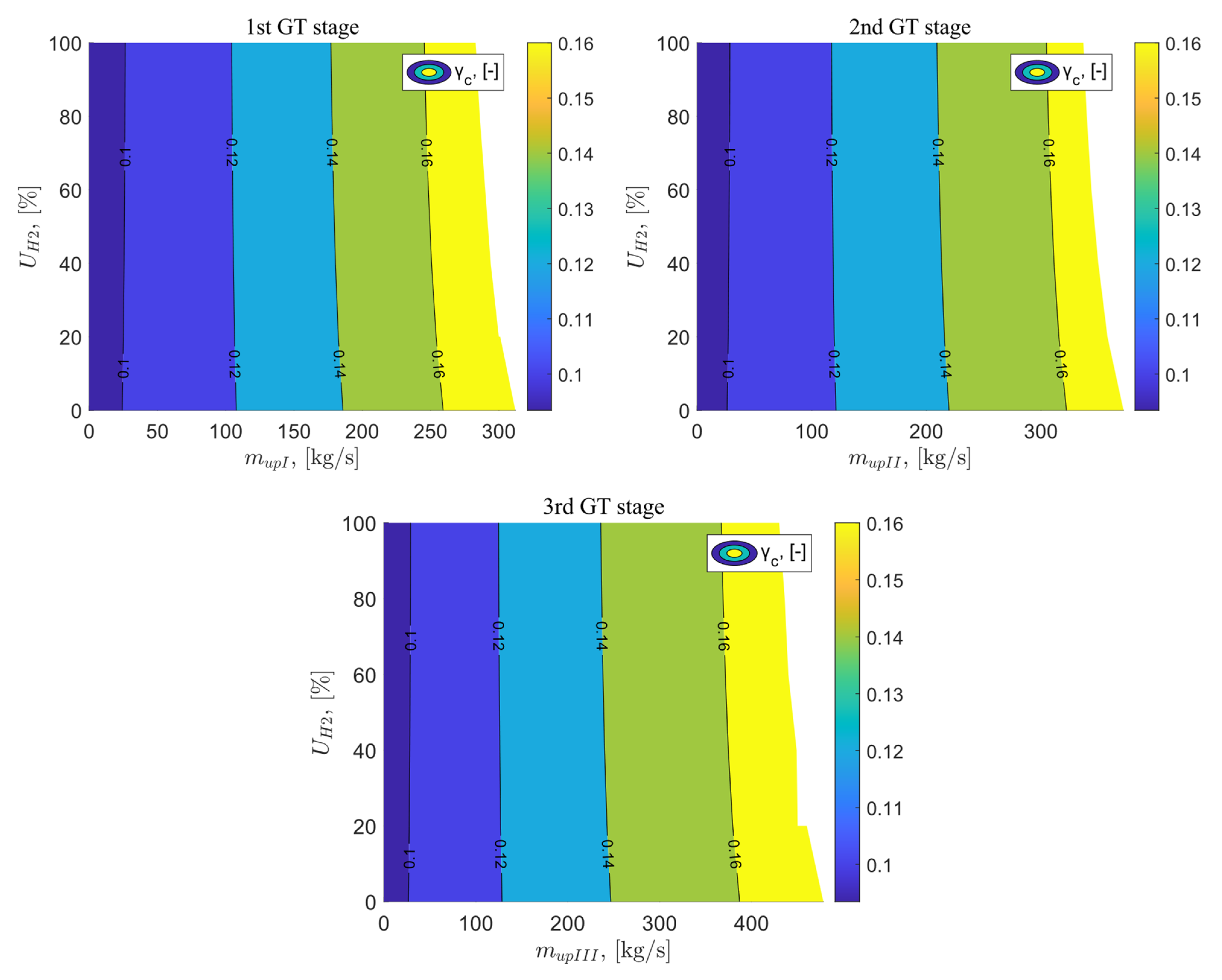 are presented as a function of the exhaust gas vented at the I, II, and III stages of the gas turbine, as well as the percentage of hydrogen in the fuel mixture. In the reference scenario, the fuel supplied is 100% methane, with a flow rate of 10.32 kg/s. In scenario B, the application of exhaust gas vented ranging from 0 to the maximum possible flow has a negligible effect on the fuel flow rate supplied to the combustion chamber. These values decrease slightly. For example, for a hydrogen percentage in the fuel mixture of 80% and