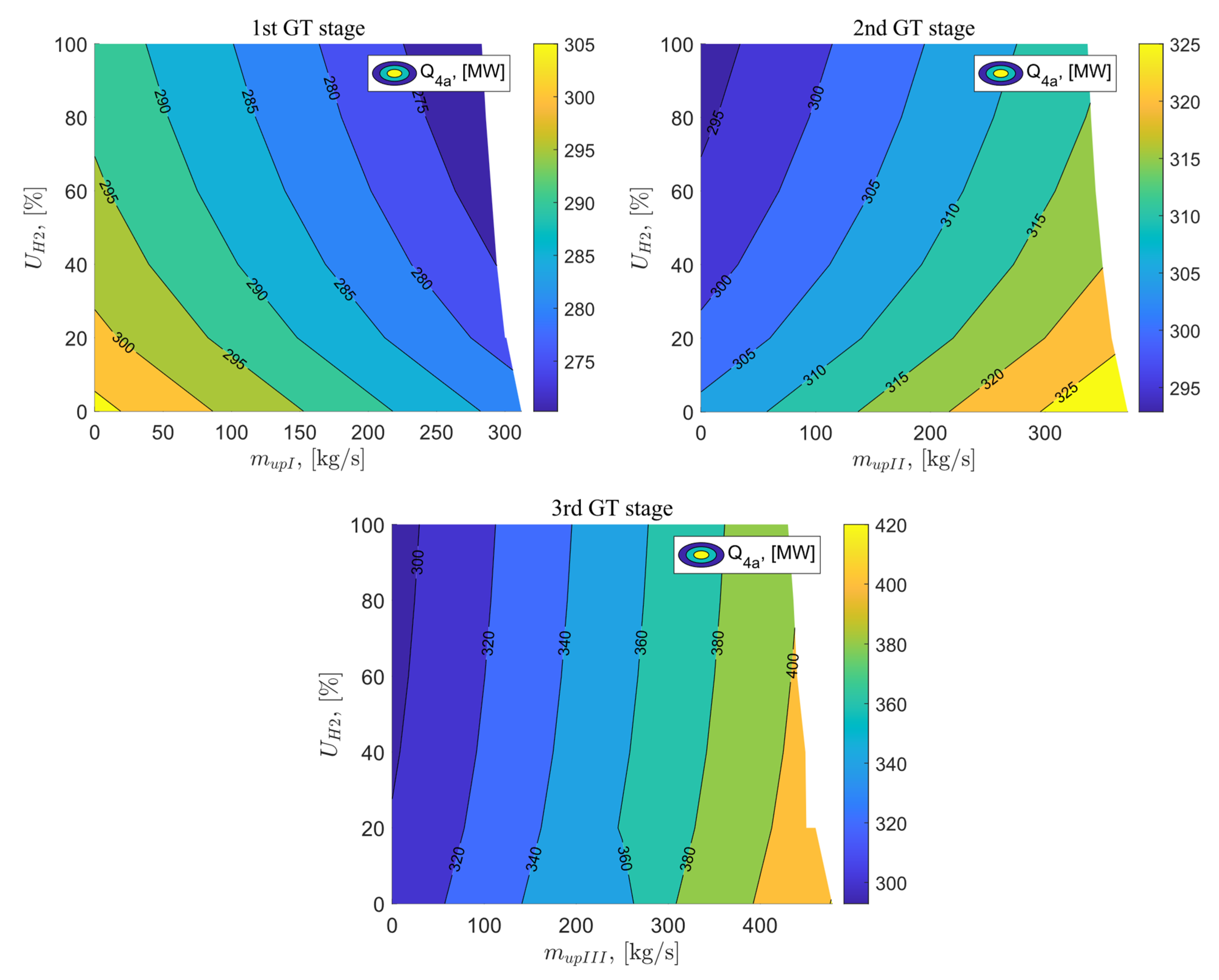 The next analyzed parameter was the heat flow supplied to the gas turbine as a function of the exhaust gas vented at the I, II, and III stages of the gas turbine and the percentage share of hydrogen in the fuel mixture, and its characteristics are presented in