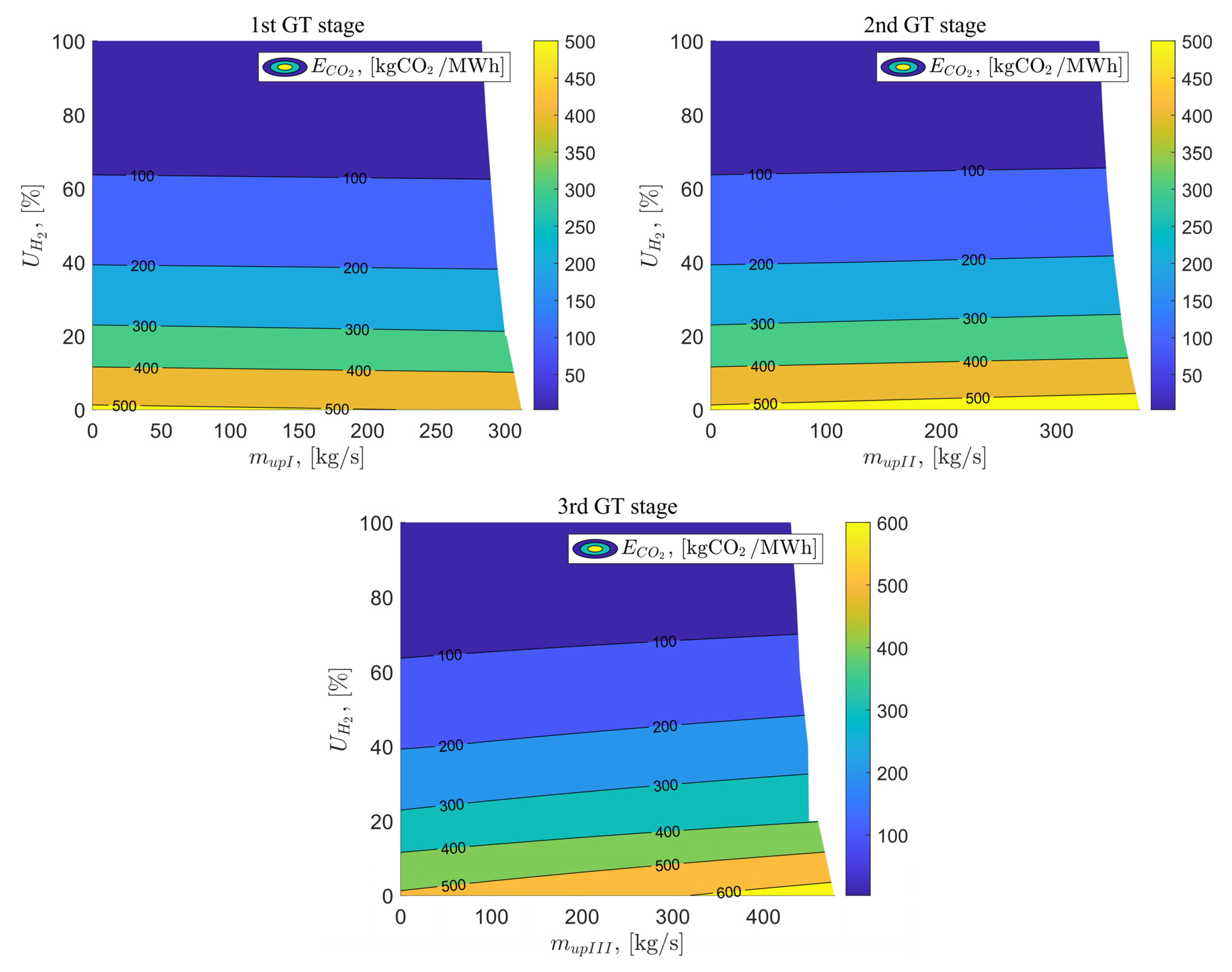 Figure 17 shows the analysis results for the carbon dioxide emissions to the environment as a function of the exhaust gas vented at the I, II, and III stages of the gas turbine, as well as the percentage of hydrogen in the fuel mixture.