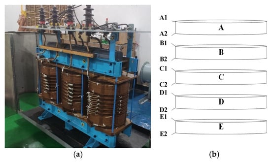 To facilitate clear description and rapid localization of fault settings in subsequent experiments, a systematic numbering scheme was designed for the windings in the central structure. During the experiment, the five double-disc windings in the transformer’s central section were numbered sequentially from top to bottom as Groups A through E, with each group comprising two disc-shaped windings. Similarly, each of the five coils corresponding to a winding is equipped with two lead-out terminals. To ensure accurate identification of different winding positions during detection and data acquisition, all lead-out terminals were also numbered sequentially from top to bottom as A1, A2, …, E2, as shown in Figure 2b.