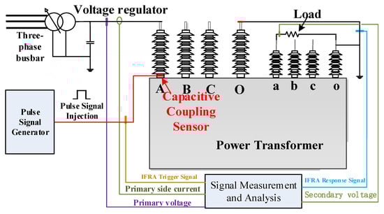 However, traditional FRA methods suffer from two core issues: first, they rely on complex excitation and frequency-sweeping systems, making true online testing difficult to achieve; second, measurement results are highly sensitive to boundary conditions such as external wiring configurations, load states, and power supply fluctuations, resulting in poor test repeatability and comparability [7]. To overcome these limitations, the impulse frequency response method (IFRA) based on short-pulse excitation has gained prominence in recent years. This approach replaces continuous sweep signals with short broadband pulses, enhancing response speed and online adaptability while maintaining spectral coverage. It demonstrates strong potential for field deployment [8,9,10,11,12].