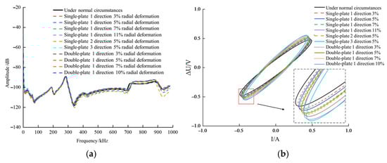 As observed in Figure 4a, the radial deformation of the winding exerts a relatively minor influence on the resonant peak and valley frequencies within the pulse frequency response, while significantly affecting the overall amplitude of the curve. Specifically, within the frequency range below 600 kHz, the positions of the resonance peaks and troughs remain largely stable. However, between 700 kHz and 1000 kHz, the resonance frequencies of the deformed windings exhibit a noticeable shift compared to the healthy state curve. Figure 4b displays the corresponding ΔU-I trajectory. Experimental data indicate that as the radial deformation rate of the winding gradually increases from 3% to 10%, its ΔU-I elliptical trajectory progressively diverges from the characteristic trajectory of the healthy state, exhibiting a trend of outward expansion.