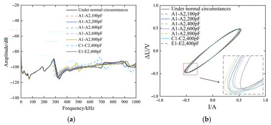 Figure 5a shows the online pulse frequency response curve for faults involving variations in the spacing between laminations. In all fault scenarios, the parallel capacitance is positioned between joints A1 and A2. The figure reveals that such deformation faults primarily affect the online pulse frequency response characteristics above 250 kHz, manifesting as a frequency shift in the resonance peak.