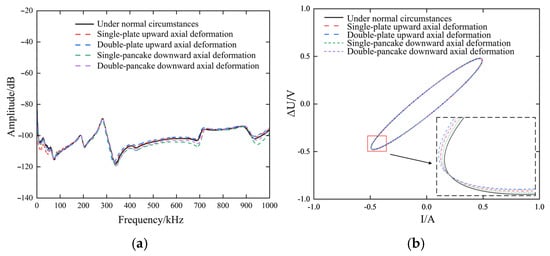 Frequency response curves under axial deformation faults. (a) Pulse Frequency Response Method (b) ΔU-I Trajectory Method.