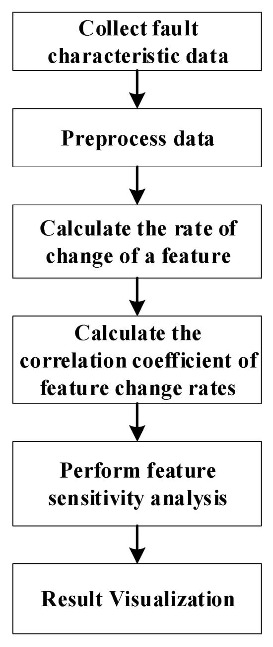 If SF,Xi is large, it indicates that feature Xi exhibits high sensitivity to fault type F and can serve as a critical feature for fault diagnosis. Based on the aforementioned theoretical analysis, a flowchart for fault feature sensitivity analysis using the correlation analysis method can be derived, as shown in Figure 7.