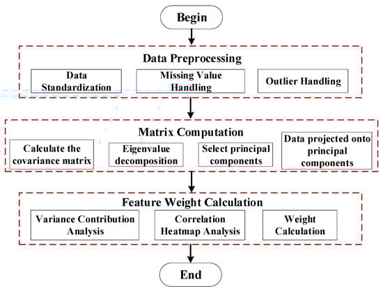 Subsequently, the covariance matrix Σ undergoes eigenvalue decomposition to yield eigenvalues and eigenvectors. The eigenvalues λ1, λ2, …, λm of the covariance matrix represent the contribution of each principal component to the data variance, while the eigenvectors v1, v2, …, vm denote the principal component directions in the new feature space. The eigenvalue decomposition process can be achieved by solving the following equation, as shown in Equation (12), where λi is the i-th eigenvalue and vi is the i-th eigenvector.