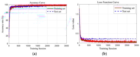 From the accuracy curve in Figure 10a, it can be observed that both the training set and test set accuracy rapidly increase as the number of training iterations grows, stabilizing after reaching a certain number of iterations. This phenomenon indicates that the model performs well on both training and test data, with no significant signs of overfitting or underfitting.