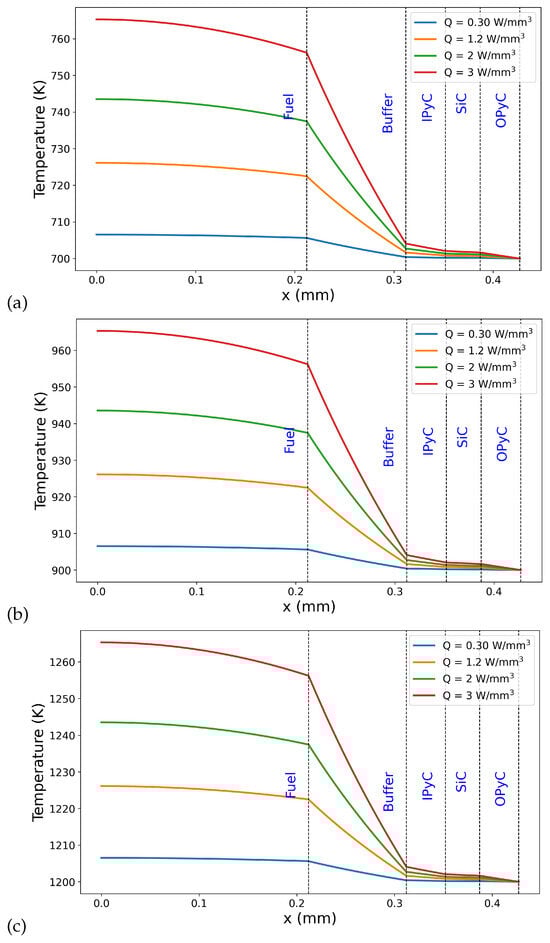 Temperature distributions across TRISO particle layers for varying internal heat generation rates (Q = 0.3, 1.2, 2.0, and 3.0 W/mm3) under three different outer boundary temperatures: (a) 700 K, (b) 900 K, and (c) 1200 K.