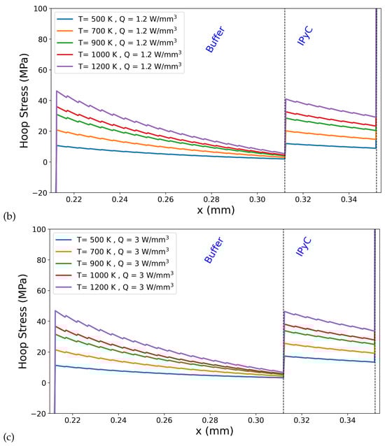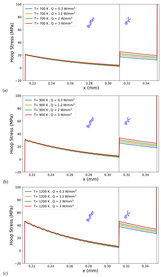 Hoop stress distributions at the buffer–IPyC interface for different internal heat generation rates (Q = 0.3, 1.2, 2.0, and 3.0 W/mm3) and outer boundary temperatures: (a) 700 K, (b) 900 K, and (c) 1200 K.