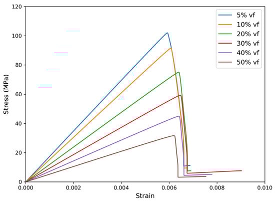 Figure 7 shows the mechanical response for void volume fractions ranging from 10% to 50%. Increase in porosity (void volume fractions) leads to a higher probability of crack initiation at lower stress state and consequently a decrease in the fracture strength. As the porosity increases, the effective load-bearing area within the buffer layer decreases, making it less resistant to elastic deformation. Similarly, Figure 7 shows that the peak strength diminishes because stress concentrations tend to localize around voids. Therefore, it promotes earlier onset of failure.