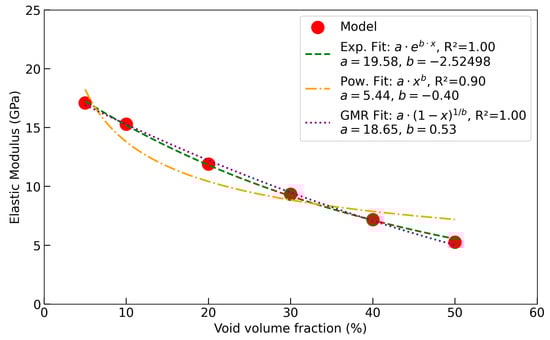 Elastic modulus as a function of porosity, shows the impact of increasing void fraction on the material’s mechanical response.